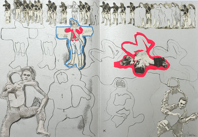 Rivers loads his images with post-modern tension, simultaneously celebrating and undermining the iconic historical imagery that is his subject. Redcoats painted pink, erotically suggestive bayonets, and crossed-out codpieces all draw attention to Rivers’ immersion in 1970s gay camp, in addition to other social concerns of his time, including the civil rights struggle and Vietnam. Rivers looked to the famous engraving, The Bloody Massacre Perpetrated in King Street, March 5, 1770, by silversmith Paul Revere.