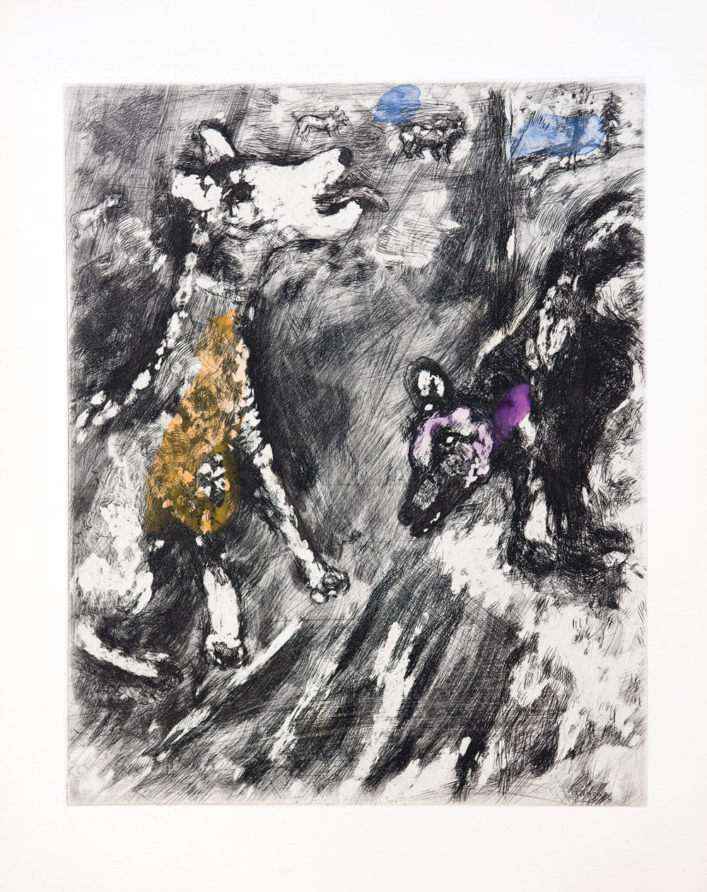 Returning to Paris in 1923 he met the art-dealer Vollard for whom he illustrated Gogol’s Dead Souls and the Fables of La Fontaine. Between 1941-47 he moved between occupied France and the USA, eventually settling near Nice. Chagall was a prolific artist, his work reminiscent of Jewish life, bible stories and of the folklore from his early years in Russia. He died in 1985.