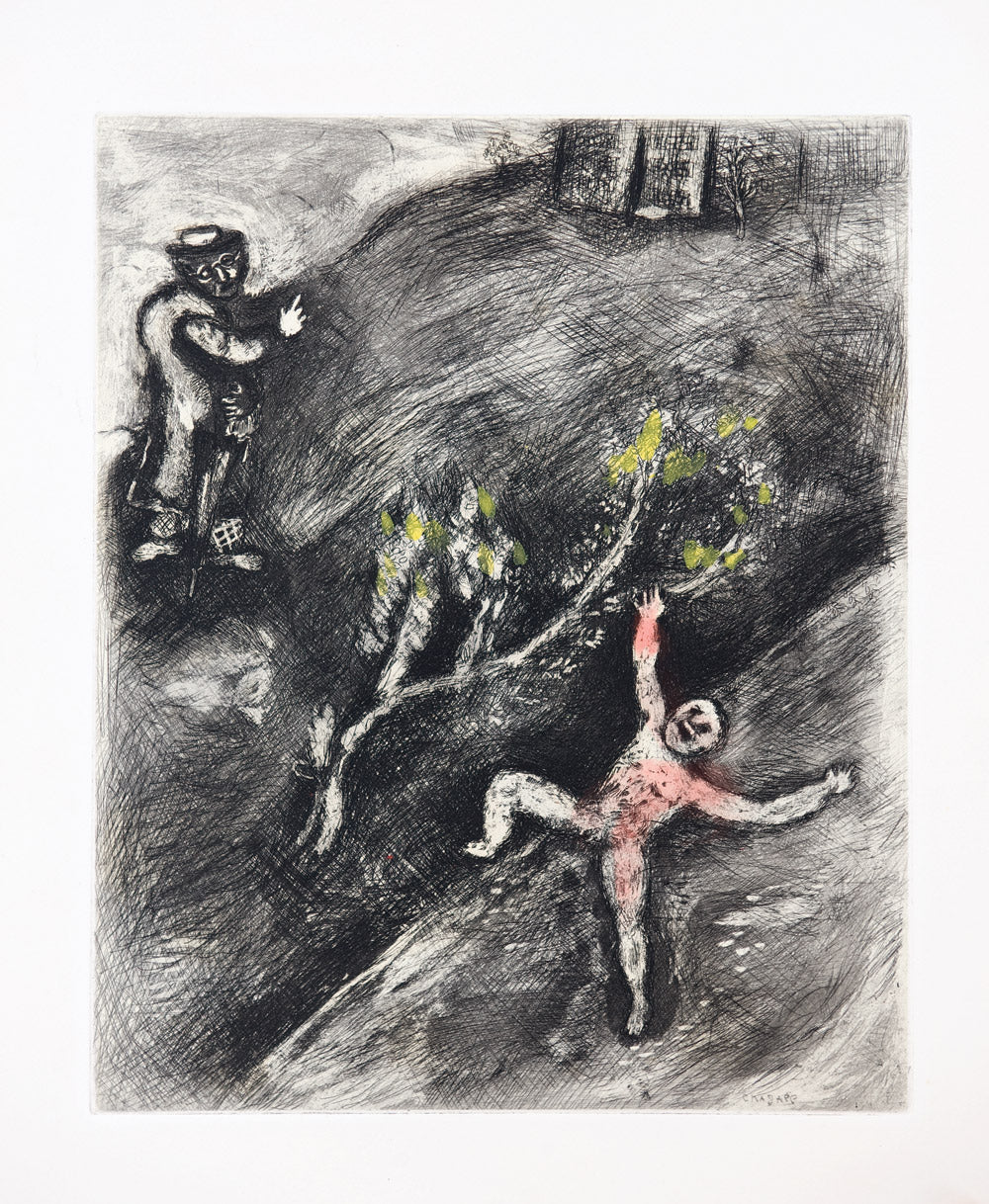 Returning to Paris in 1923 he met the art-dealer Vollard for whom he illustrated Gogol’s Dead Souls and the Fables of La Fontaine. Between 1941-47 he moved between occupied France and the USA, eventually settling near Nice. Chagall was a prolific artist, his work reminiscent of Jewish life, bible stories and of the folklore from his early years in Russia. He died in 1985.