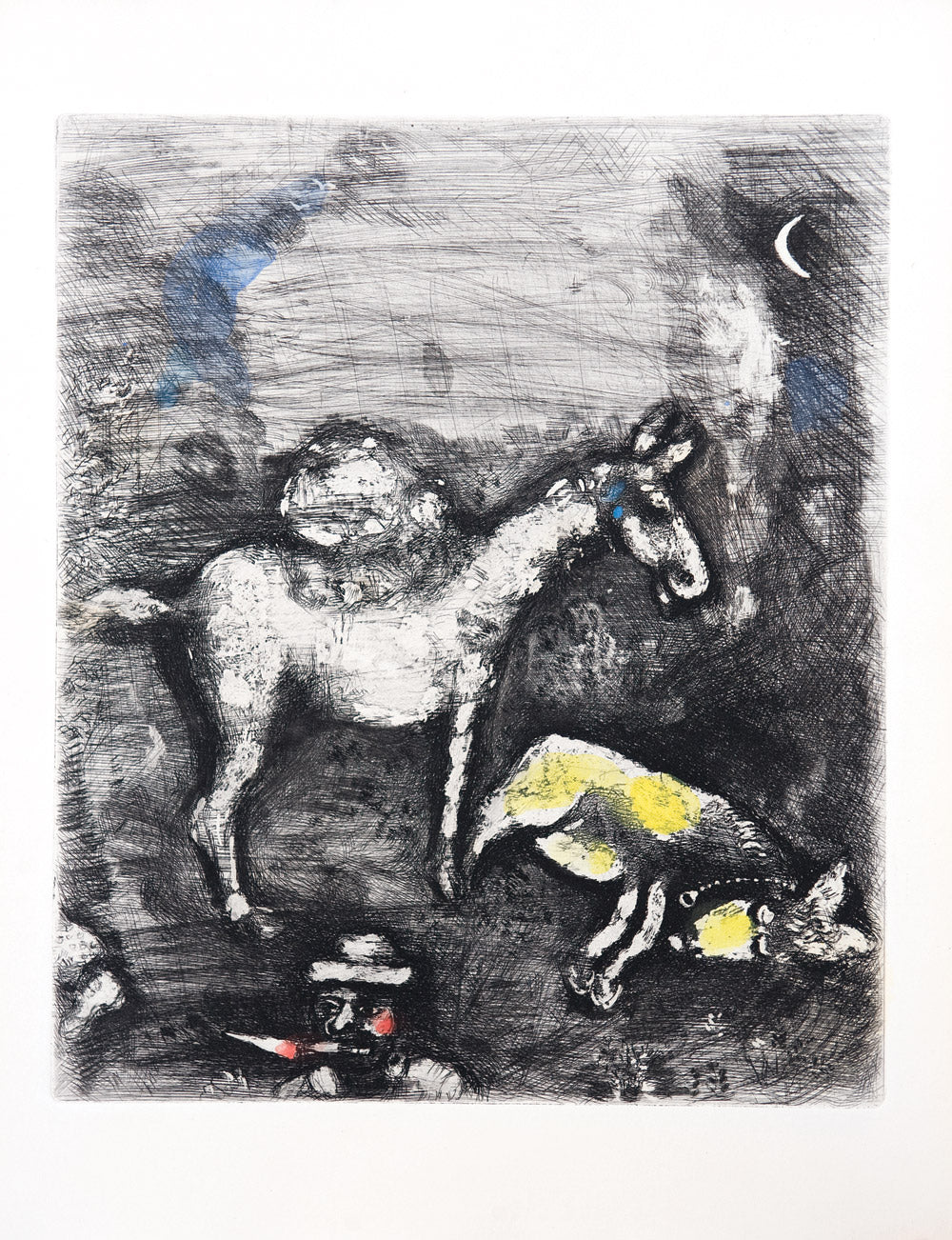 Returning to Paris in 1923 he met the art-dealer Vollard for whom he illustrated Gogol’s Dead Souls and the Fables of La Fontaine. Between 1941-47 he moved between occupied France and the USA, eventually settling near Nice. Chagall was a prolific artist, his work reminiscent of Jewish life, bible stories and of the folklore from his early years in Russia. He died in 1985.