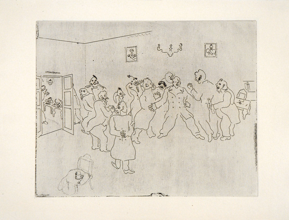 The etchings for the Dead Souls were executed between 1923 and 1927 and printed in 1927 where they then lay in Vollard’s warehouse ‘sleeping their sweet sleep’ as Chagall put it. They were finally united with the text and published by Tériade in 1948 after Vollard’s untimely death.