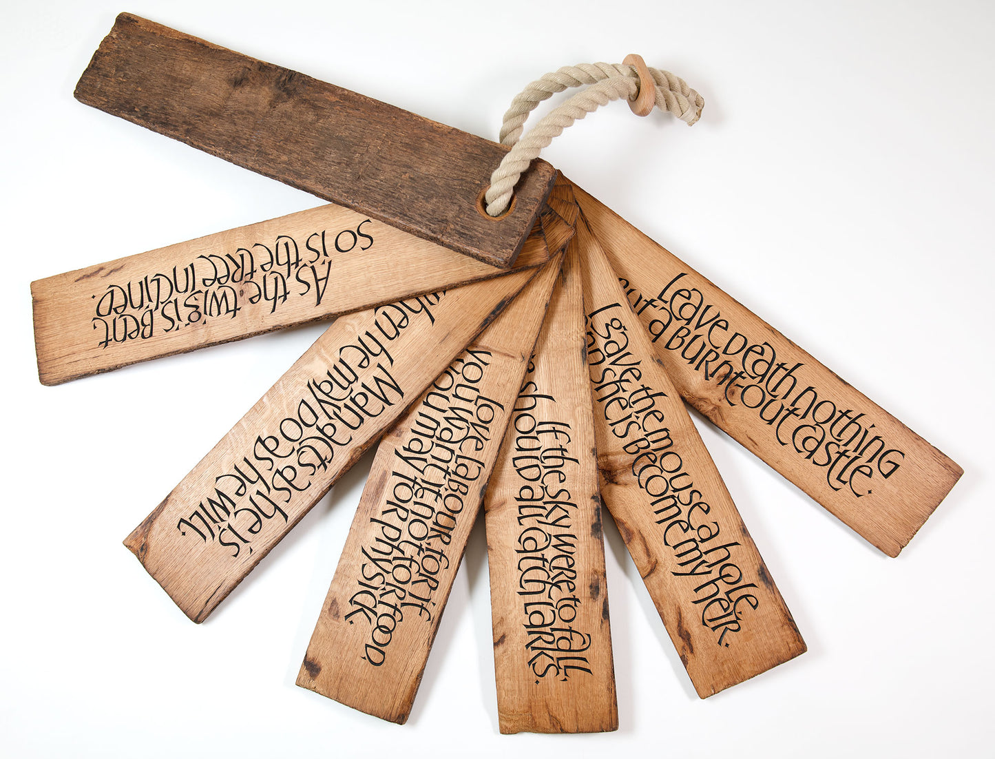 The wood was a baulk of heavily-weathered oak, given to Wenham a good thirty years ago. Friend and colleague Tony Walker cu it into boards and planed them up, but it was so full of splits and knots that Wenham had a hard time considering what to do with it. Some years ago Wenham became aware that the poet George Herbert had made a very large collection that was published after his death as Outlandish Proverbs. Some of these were amusing and intriguing, but this project began when Wenham's wife read out the translation of a Spanish (or French) proverb about the sky falling. This set Wenham thinking and searching for more of these proverbs, and also suggested a use for the old, weathered and flawed but interesting wood.