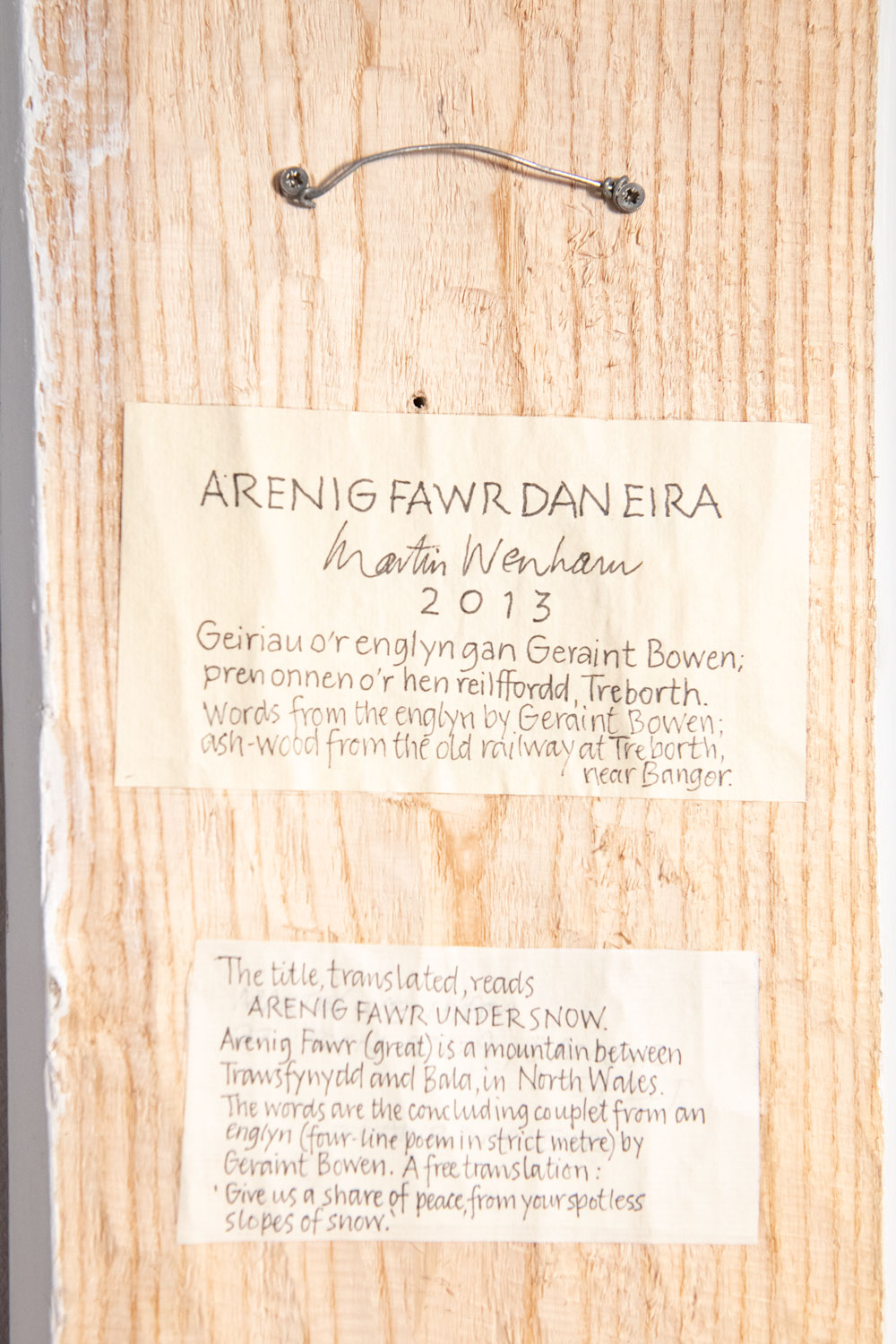 The words are the concluding couplet from an englyn (four line verse in strict metre) by Geraint Bowen (1915-2011) and freely translated, they read: Give us a share of peace/ from your spotless slopes of snow.