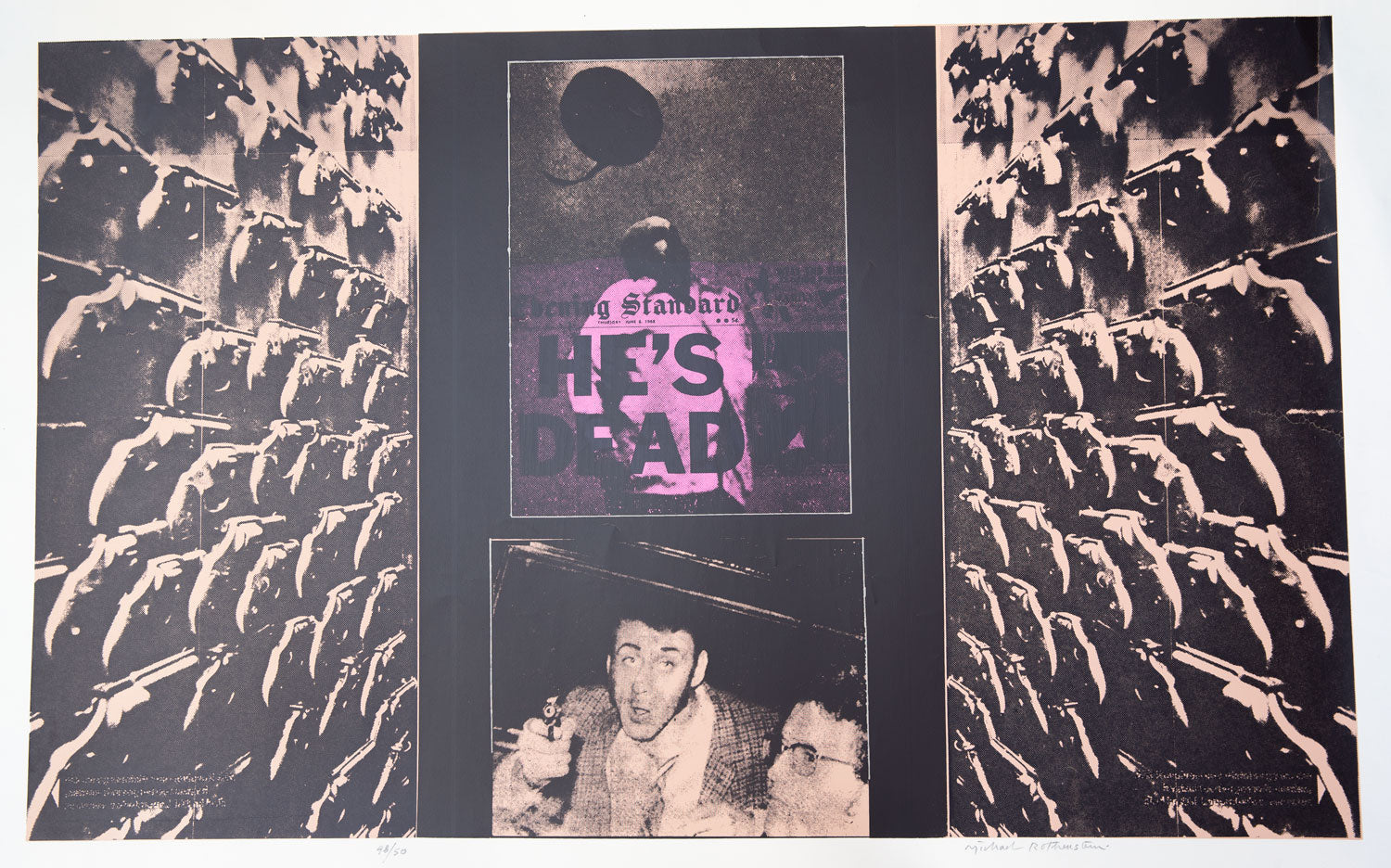 Many kinds of violence come together in this print. The main feature is a line-up of guns from a West German magazine photograph, the headlines refer to Robert Kennedy's death and the shot man is Cornelio Rojas shot by firing squad.