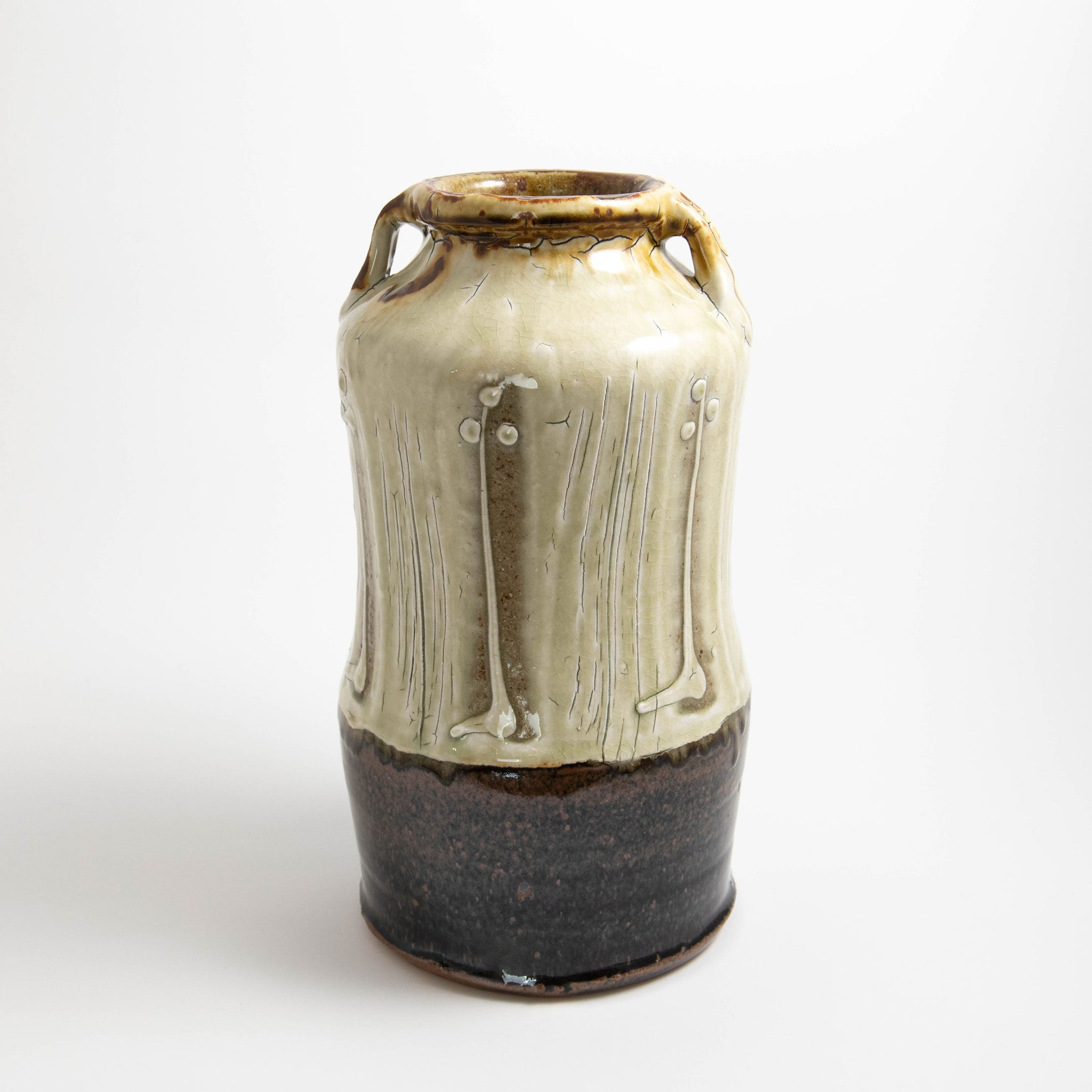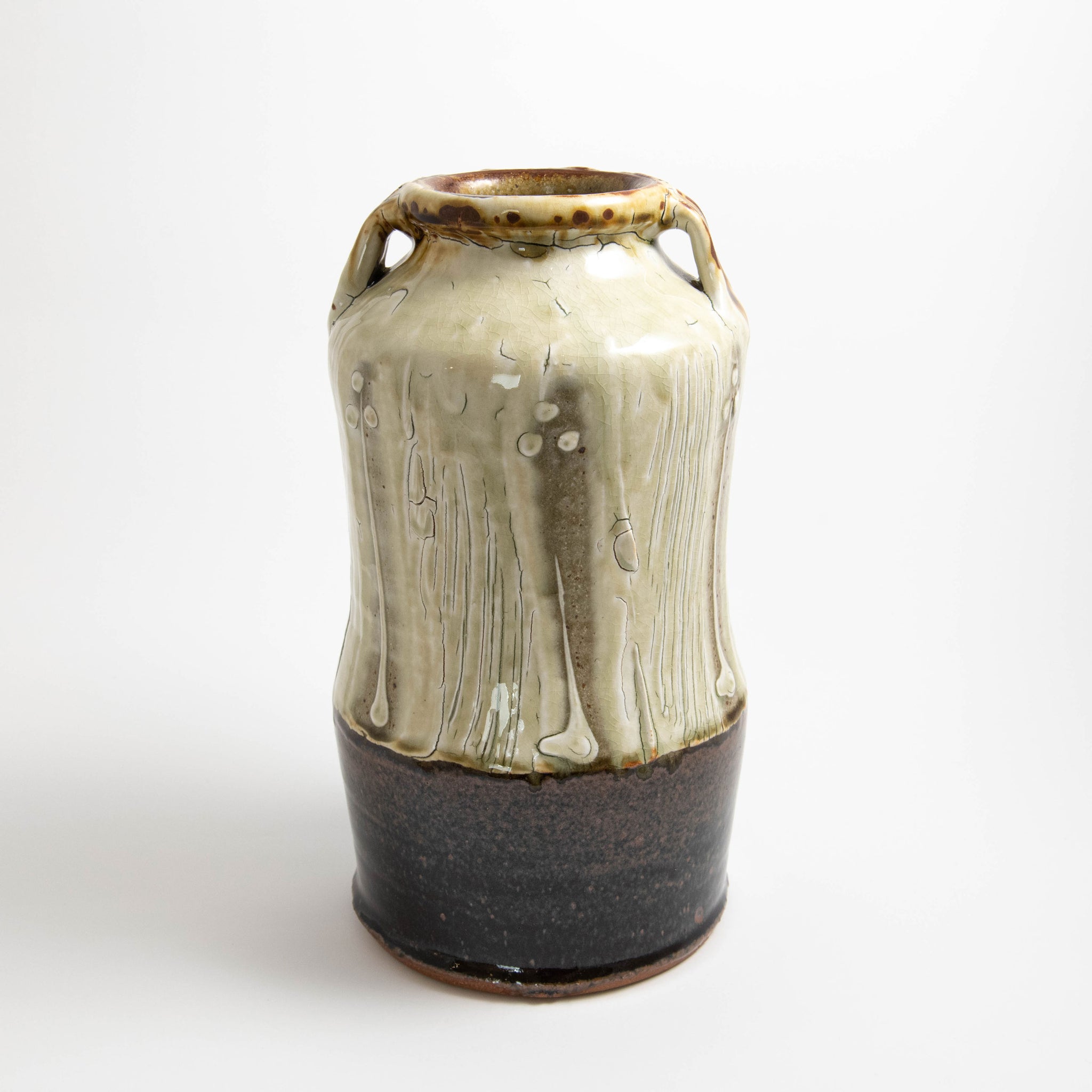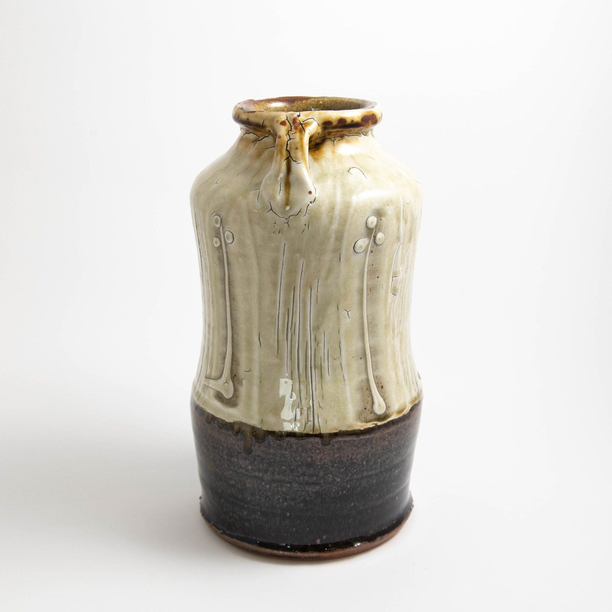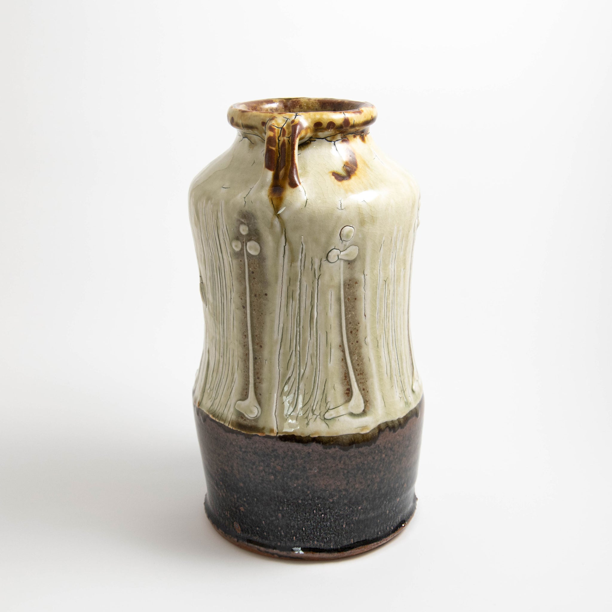 Two handles. Ash glaze over crackle slip with iron on top. Porphyry glazed bottom half