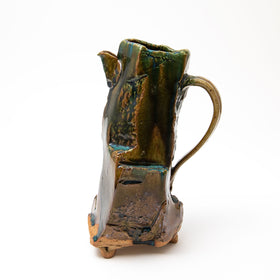 Her sake ‘monsters’ combine Jurassic dinosaur bodies with dainty beaks and curled up feet, while her jungle-green Oribe, cresting and pooling into opaque aquamarine blue, is a thing of prehistoric beauty.