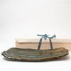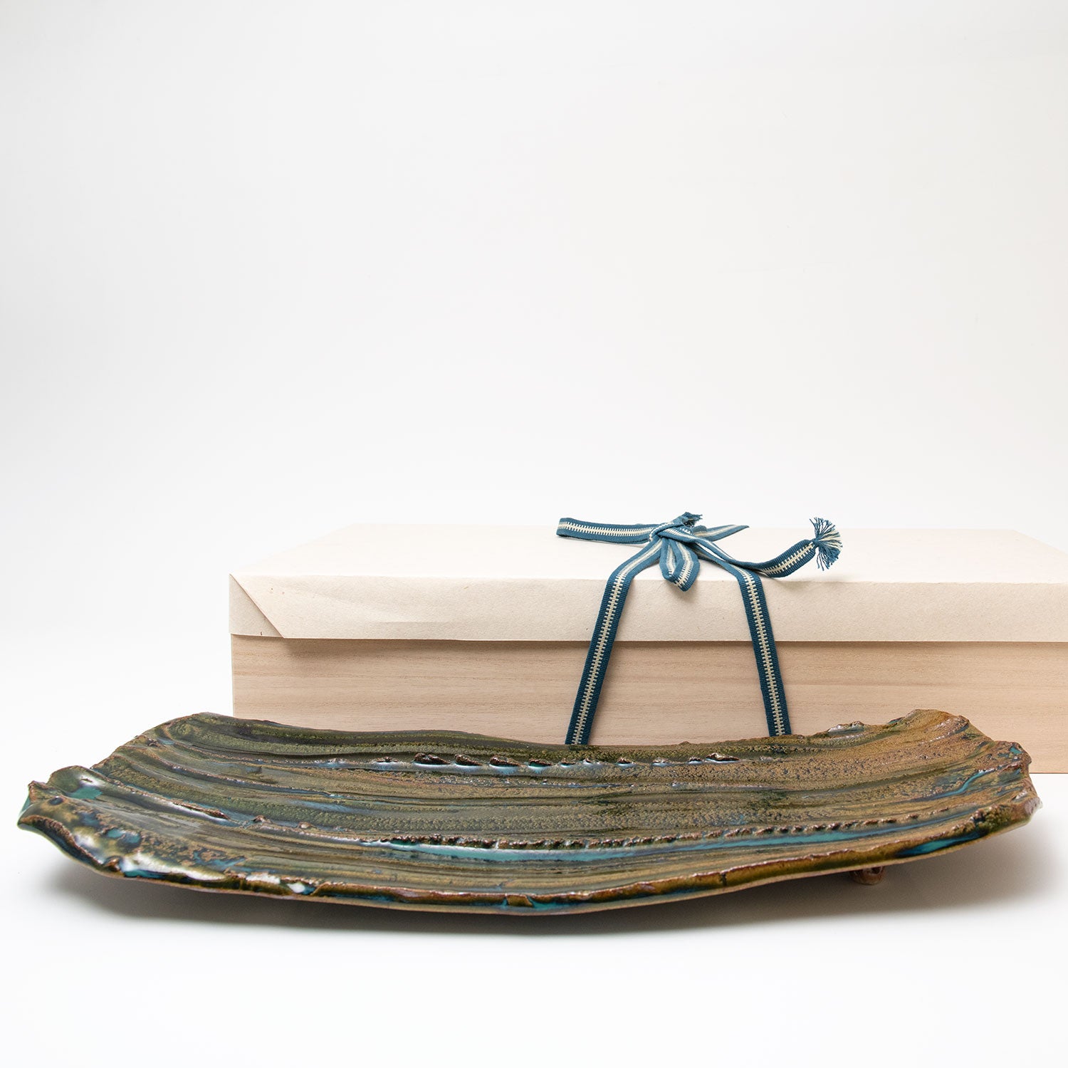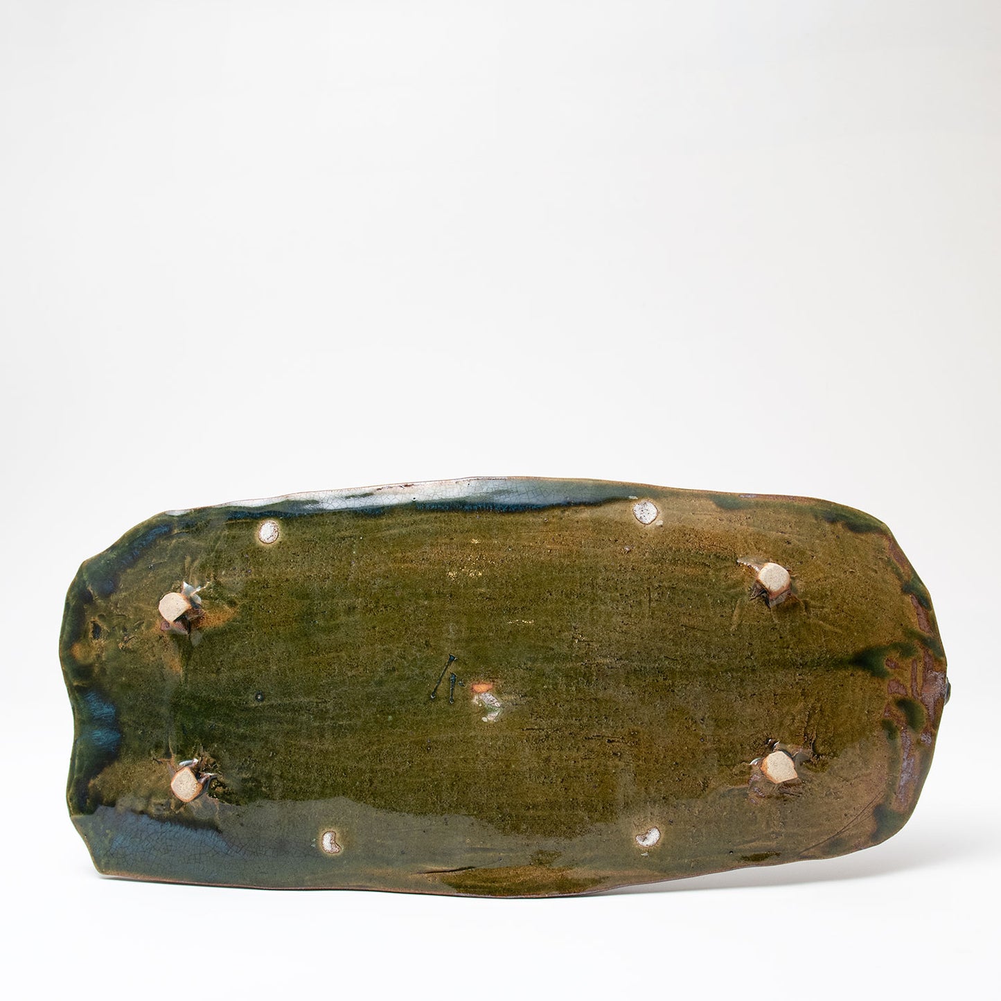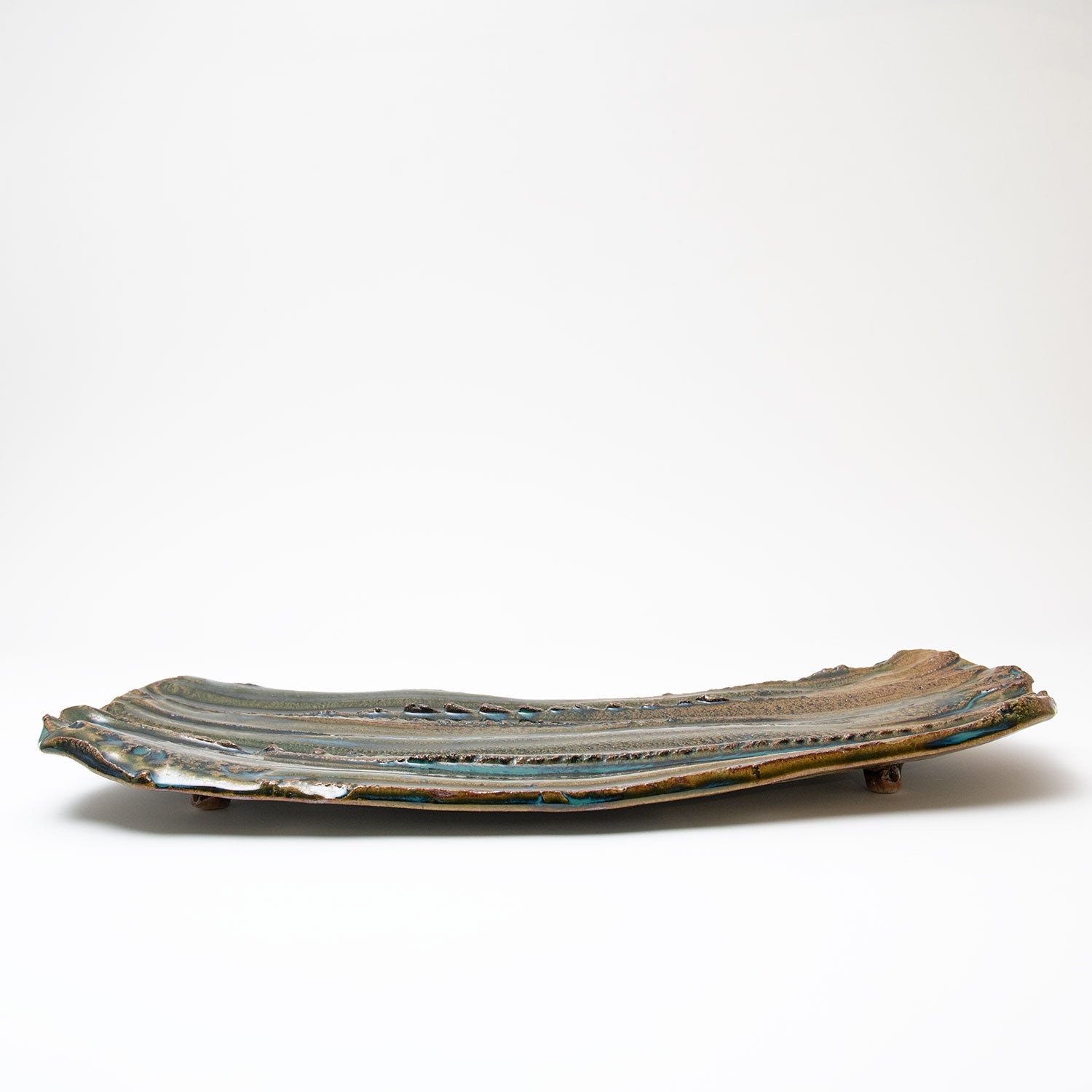 Her sake ‘monsters’ combine Jurassic dinosaur bodies with dainty beaks and curled up feet, while her jungle-green Oribe, cresting and pooling into opaque aquamarine blue, is a thing of prehistoric beauty.