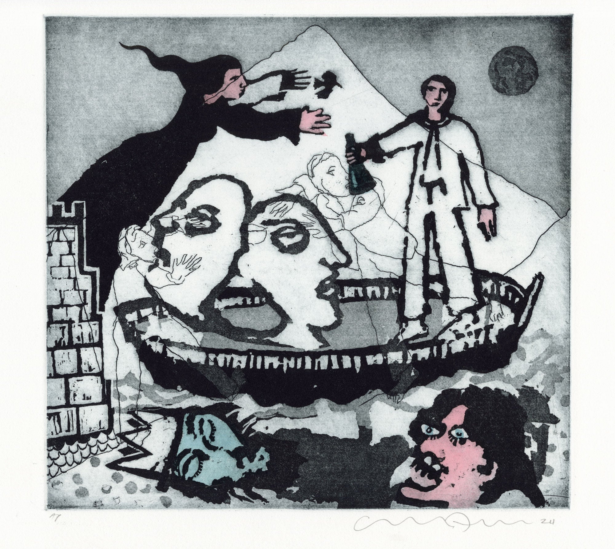 Signed etching with sugarlift, aquatint and hand colouring.