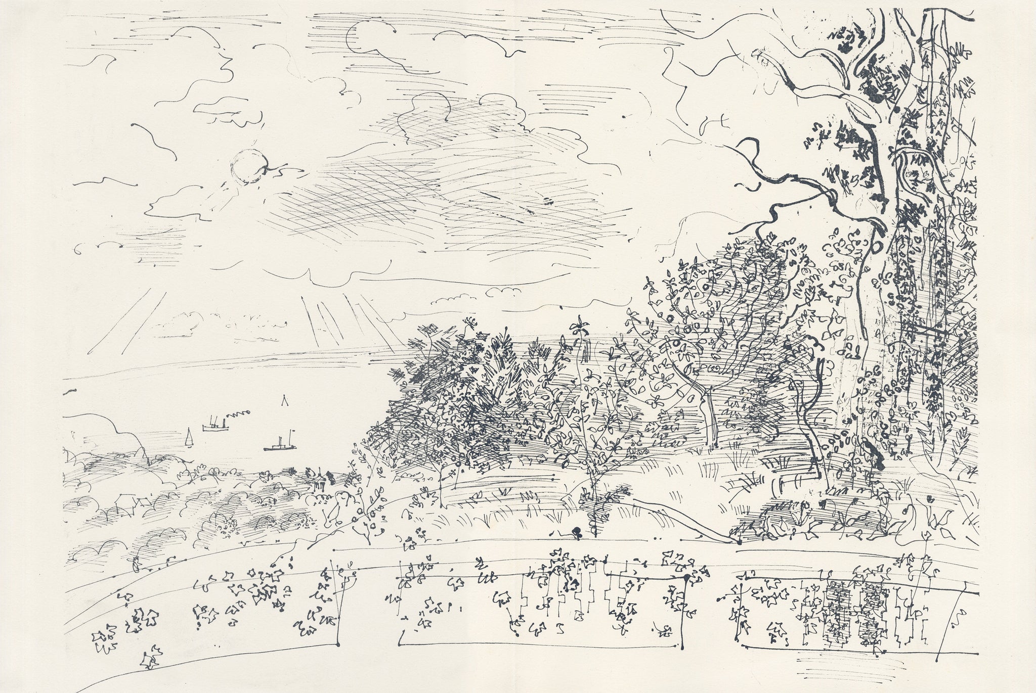 Dufy’s work is characterized by brightly coloured drawings suiting the glittering scenes of luxury and pleasure he favoured; the accessibility of his work lent itself to commercial advertising and was widely copied as a result. Dufy died at Forcalquier in 1953 and was buried near Matisse in Cimiez, a suburb of the city of Nice.