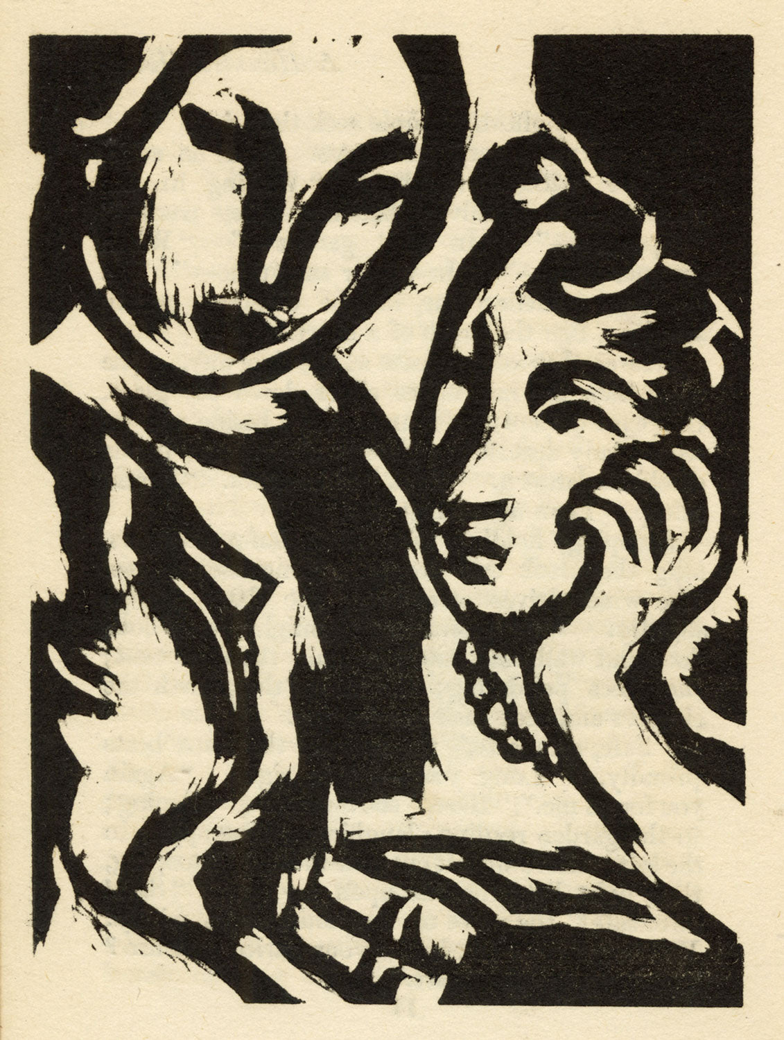 Woodcut printed for Monday or Tuesday by Virginia Woolf, published by Leonard & Virginia Woolf at The Hogarth Press, Hogarth House, in an unnumbered edition of 1000.