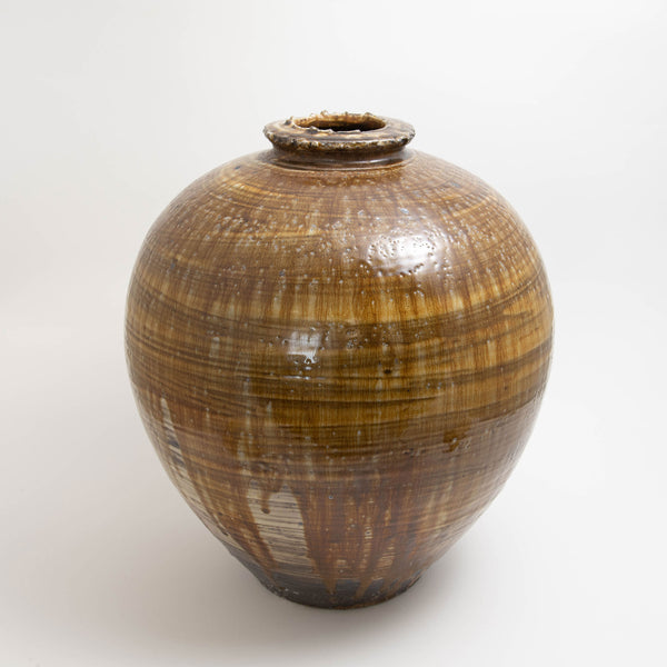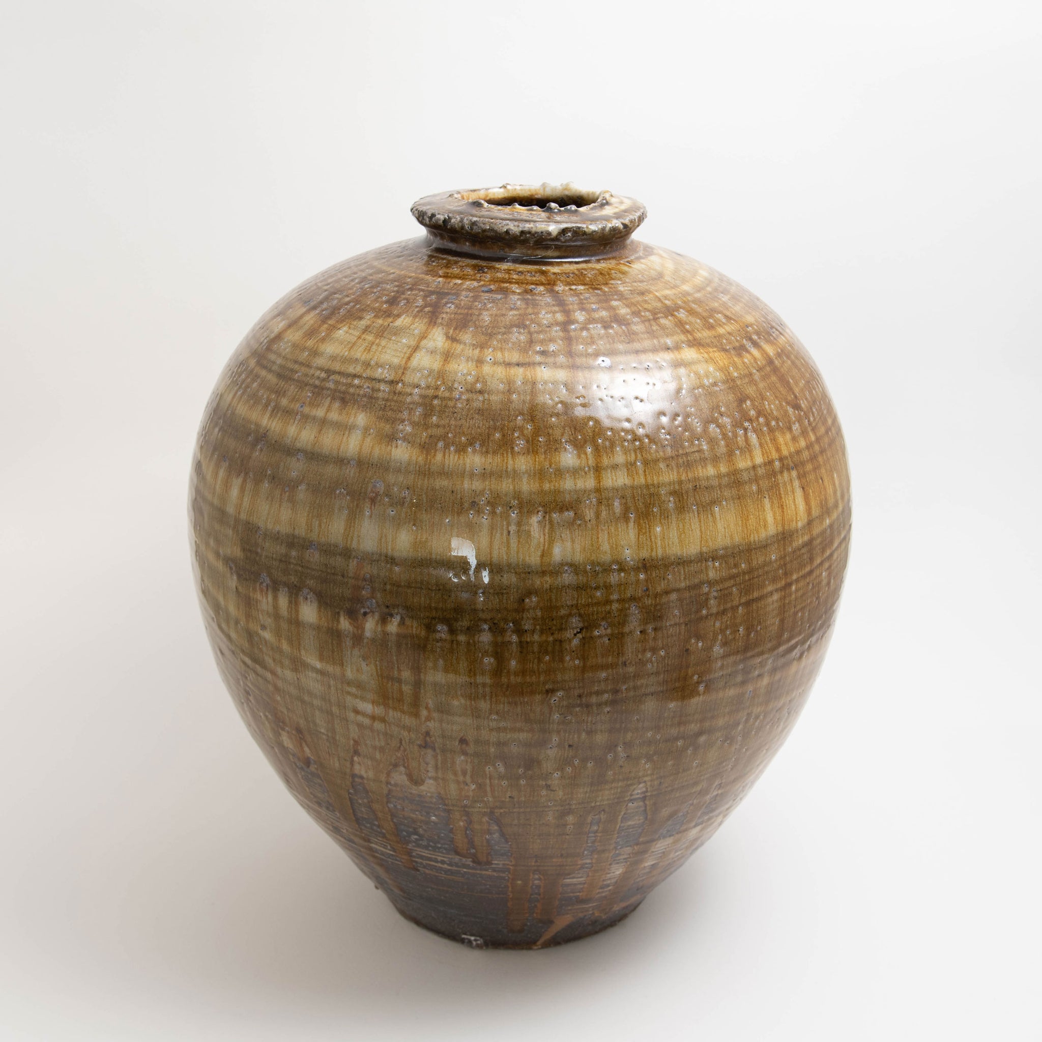 Dark clay. Ash glaze over brushed porcelain slip. Salt glaze