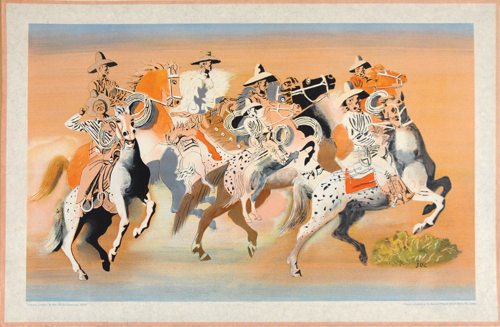 Ulreich was born in Hungary, but his family emigrated the same year to America. He studied at the Kansas City Art Institute and the Pennsylvania Fine Arts Academy. A noted muralist, he produced work for the Chicago World Fair and for the Radio City Music Hall. He also worked as an illustrator and an interior designer for major public buildings. As an artist he seems to have drawn his subjects from the Wild West and in 1941 he illustrated a children's book on Navaho Indians. Arizona Cowboys seems typical of his work both in subject matter and in being in the decorative style of a muralist and interior designer.