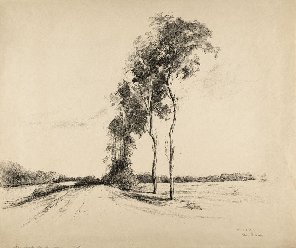 Early in her career Gabain decided to concentrate largely upon lithography, her subjects often lone girls or women in domestic interiors, usually working in black and white and occasionally employing colour to highlight details. During World War II Gabain was appointed an Official War Artist and her lithographs continued to be purchased until the end of the war. She died in 1950.