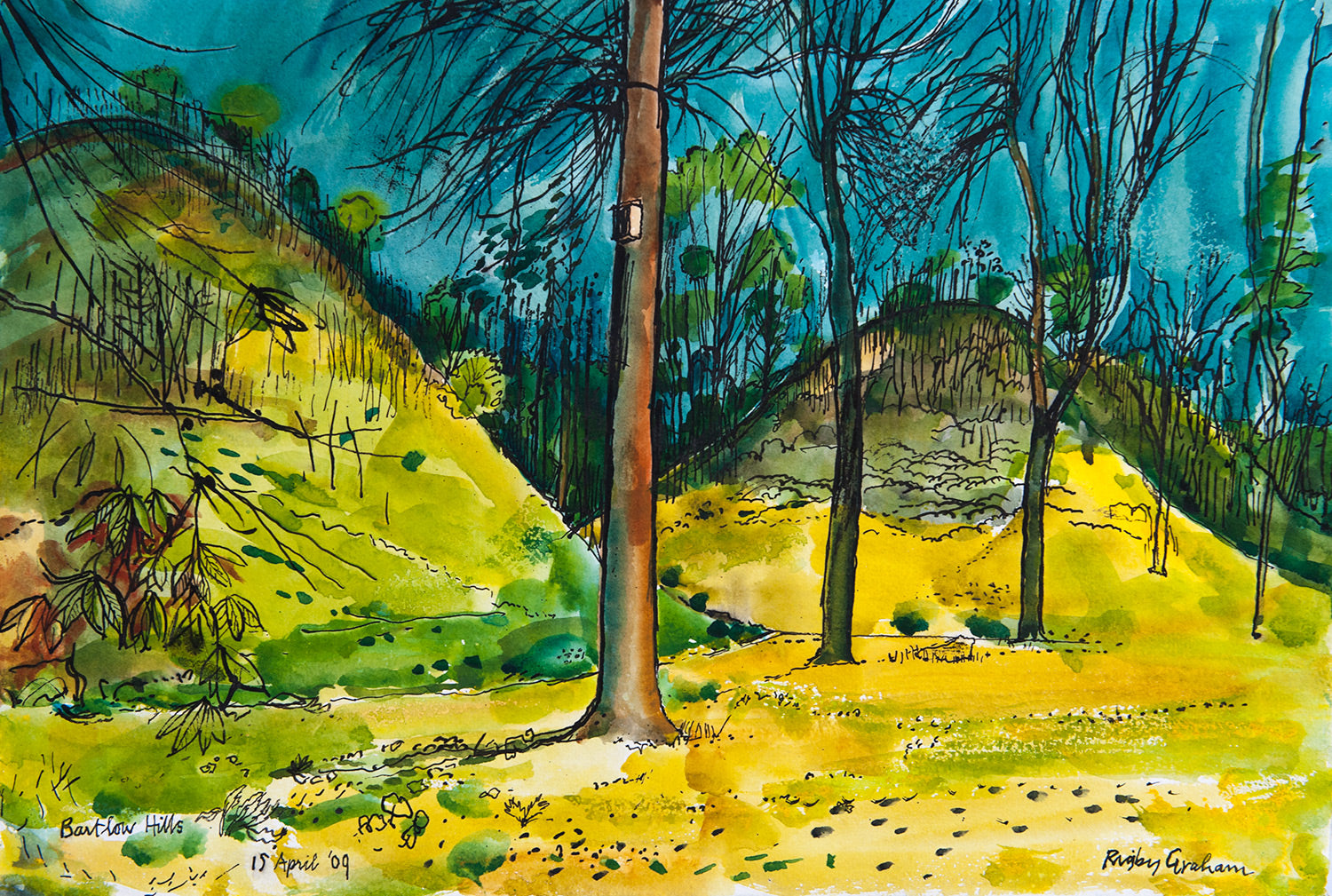 The Iron Age Celtic burial mounds of Bartlow Hills are onceived in luminous yellows and greens shrouded by a mass of vertical trees.
