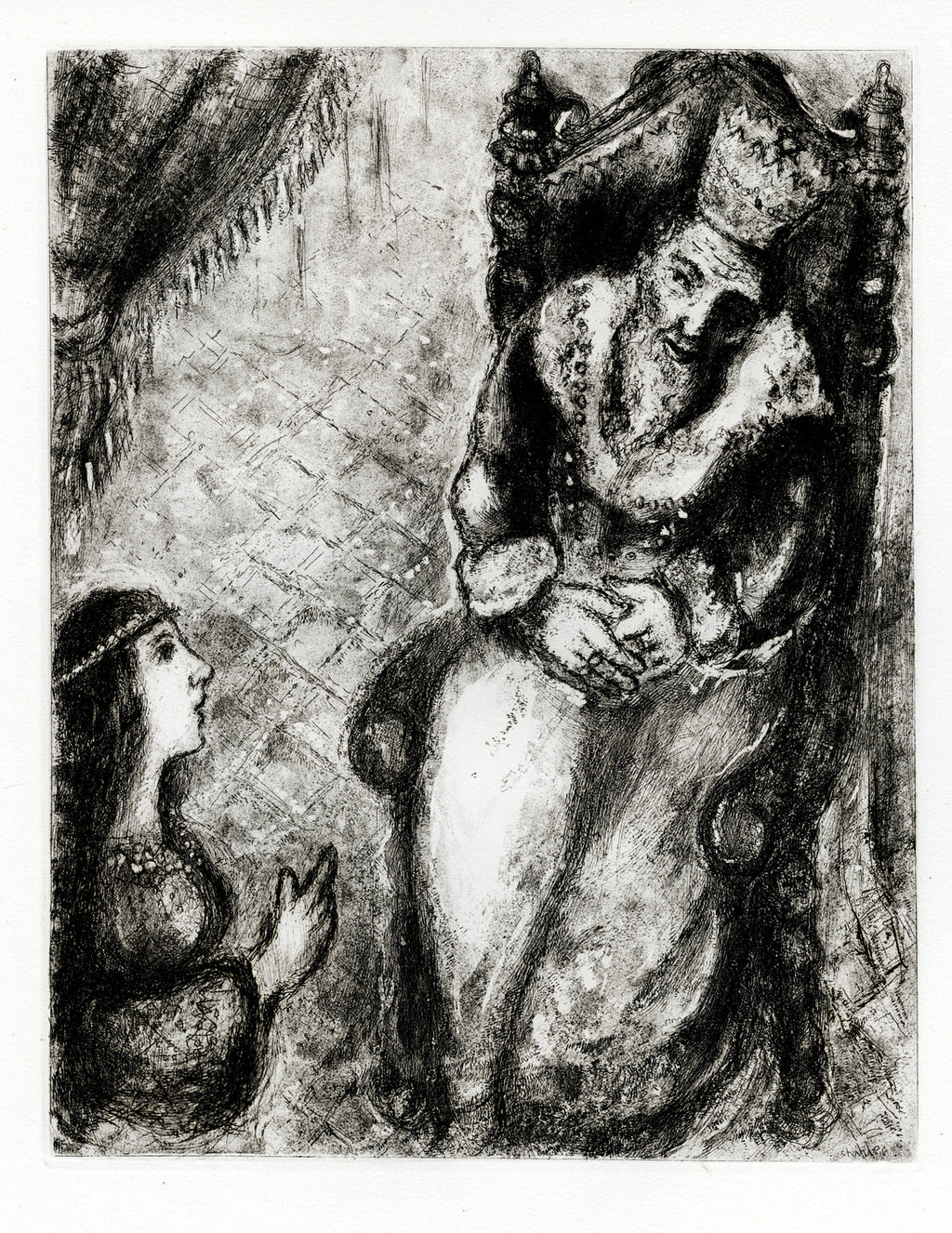 This etching is from Chagall’s sublime Bible series. Almost 10 years in the making, and comprising over 100 etchings, it was the third of Chagall’s etching suites to be commissioned by the publisher Ambroise Vollard. Chagall’s Jewish identity had always informed his work; in this major suite, begun in 1930, it was to take centre stage.