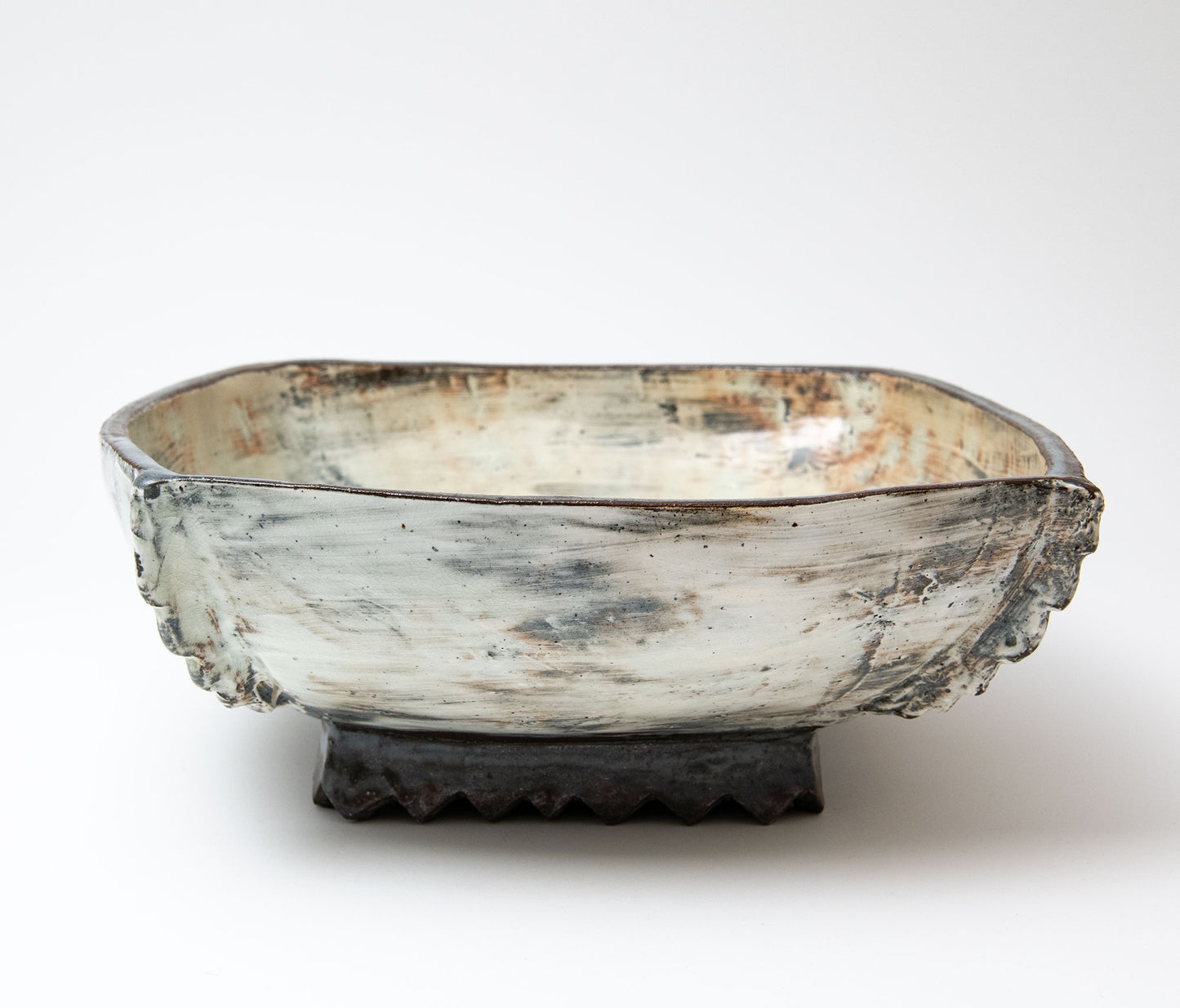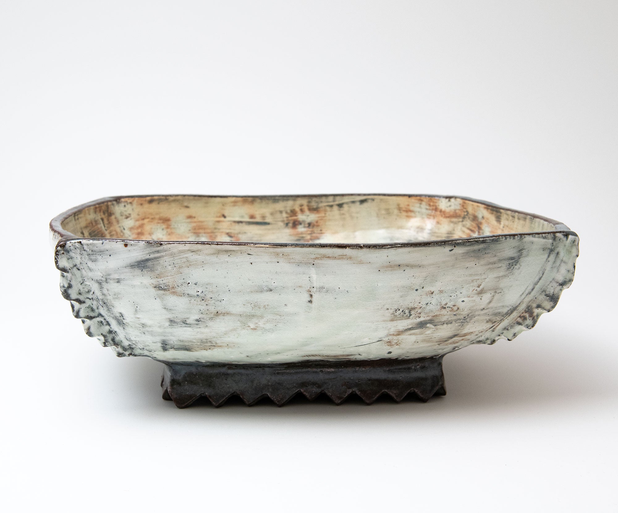 Lee decorates his pots using the traditional Korean method of Punch'ŏng. White slip is applied to a dark stoneware body. Spread with his hands, and incised with tools. Sometimes different coloured slips are flicked over the white surface, in a Jackson Pollack like way. A stiff bristled brush may be used to scratch into the semi dry surface of the pot. Forest, waterfall, the sky - nature is very much in evidence in Lee's beautiful pots.