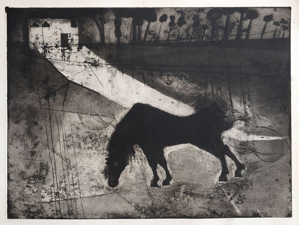 The horse is bitten to print a deep black and the tree reflections scraped. Ives Farm was close to the Rothenstein's home in Great Bardfield and frequently visited.
