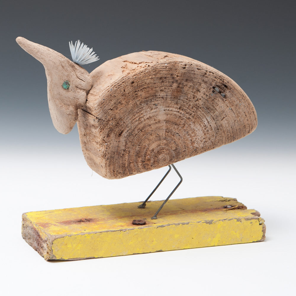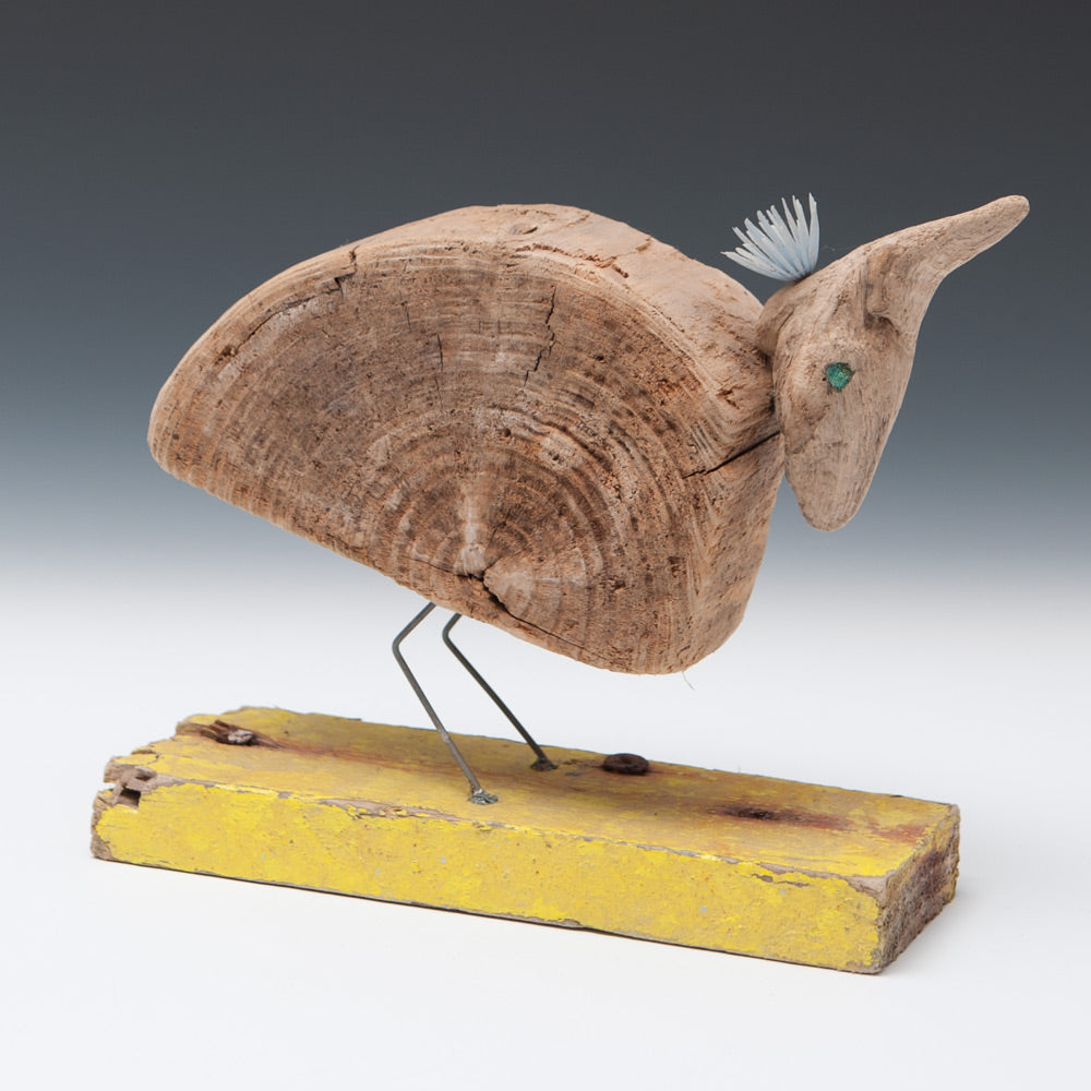 He is now based in Borth near Aberystwyth in Wales, where the flotsam and jetsam from the nearby sea is his only source of materials. Working with found objects, nothing is changed - simply introduced to one another. His driftwood pieces, usually birds, boats or mythical beasts, are full of his passion, integrity and wonderful humour.