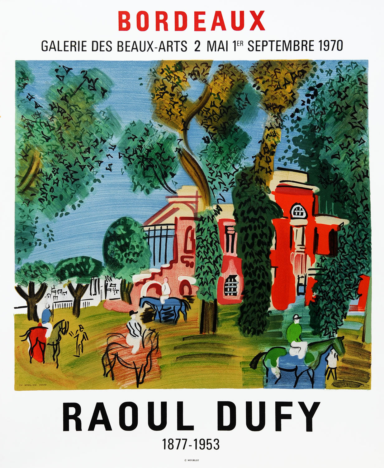 Dufy’s work is characterized by brightly coloured drawings suiting the glittering scenes of luxury and pleasure he favoured; the accessibility of his work lent itself to commercial advertising and was widely copied as a result. Dufy died at Forcalquier in 1953 and was buried near Matisse in Cimiez, a suburb of the city of Nice.