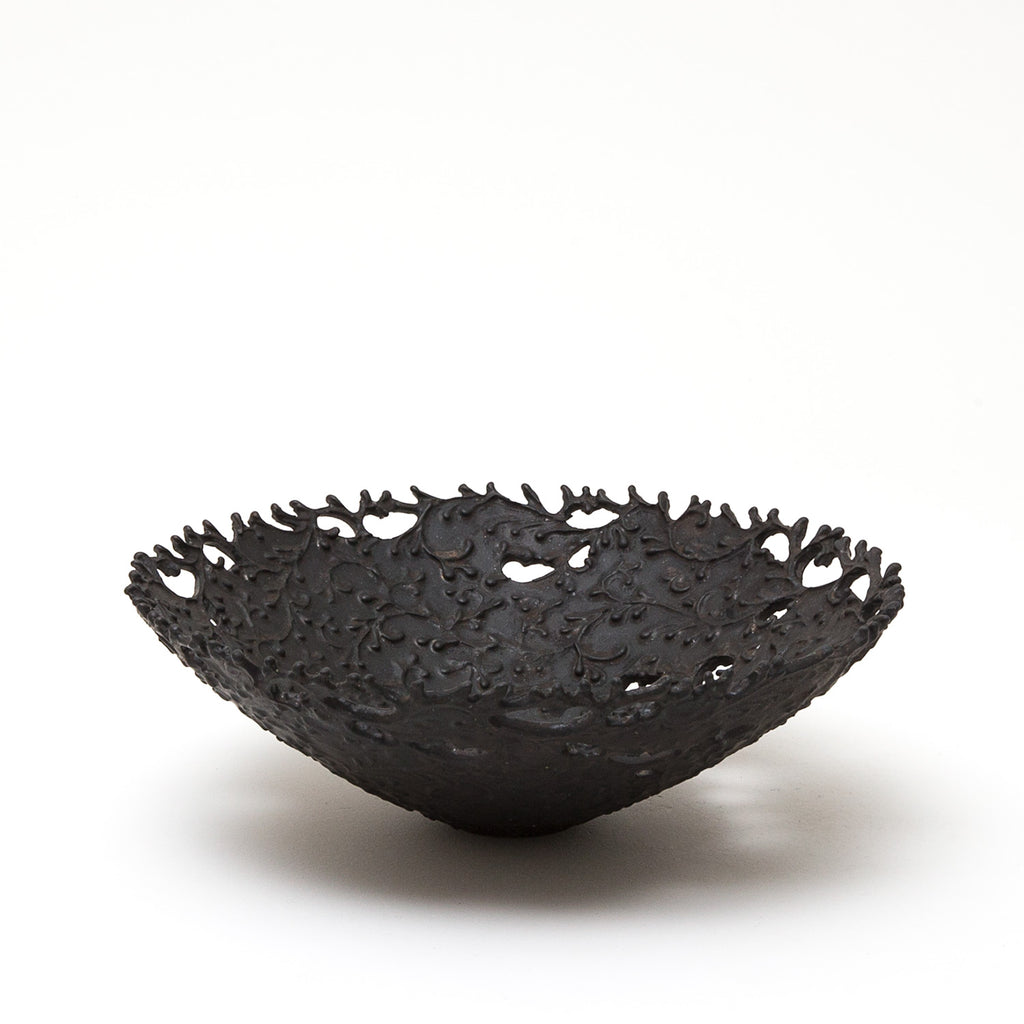 With smoky, metallic glazes he captures the ornate opulence of Persian and Moorish silverware, tempering their extravagance with a minimalism of black and white surfaces.