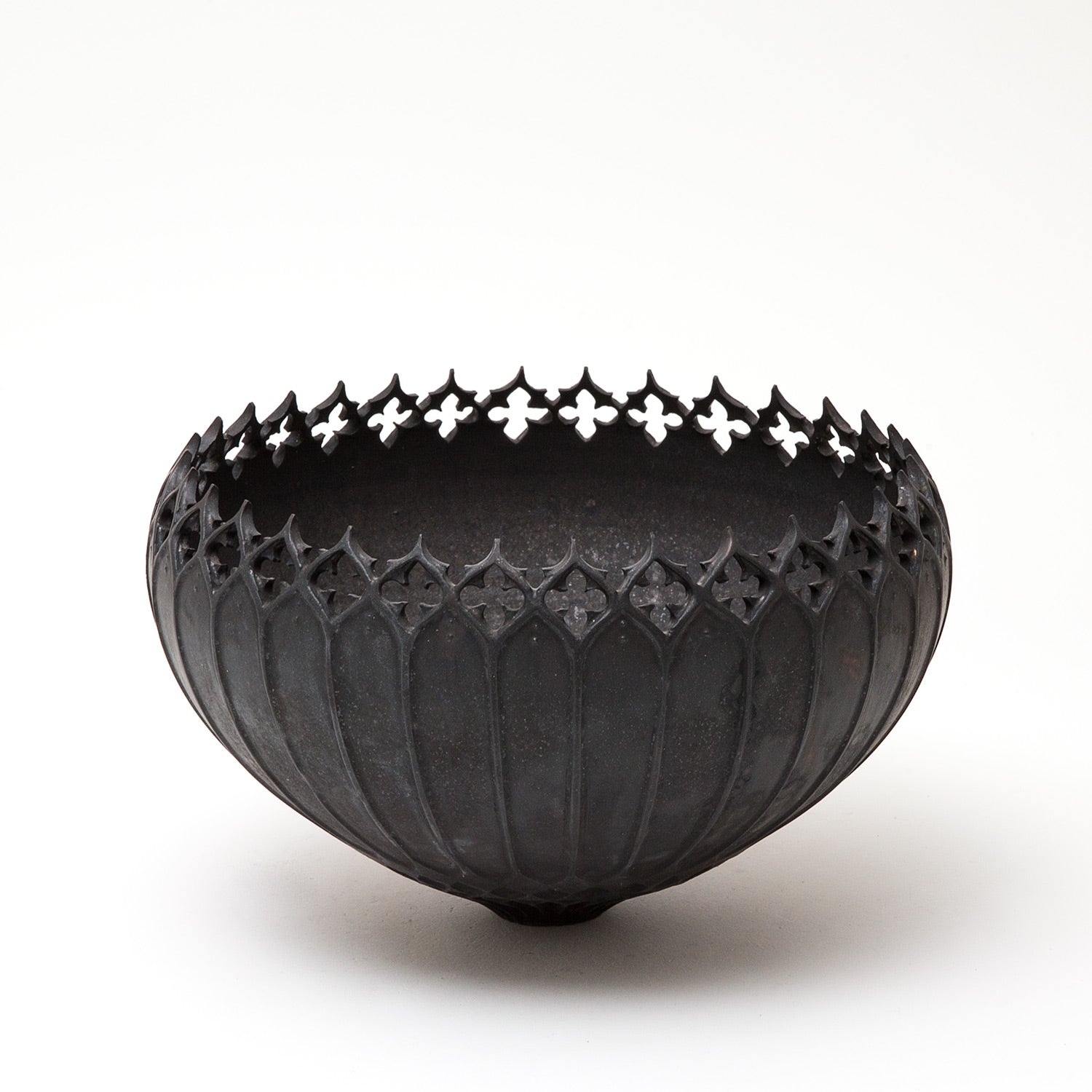 With smoky, metallic glazes he captures the ornate opulence of Persian and Moorish silverware, tempering their extravagance with a minimalism of black and white surfaces.