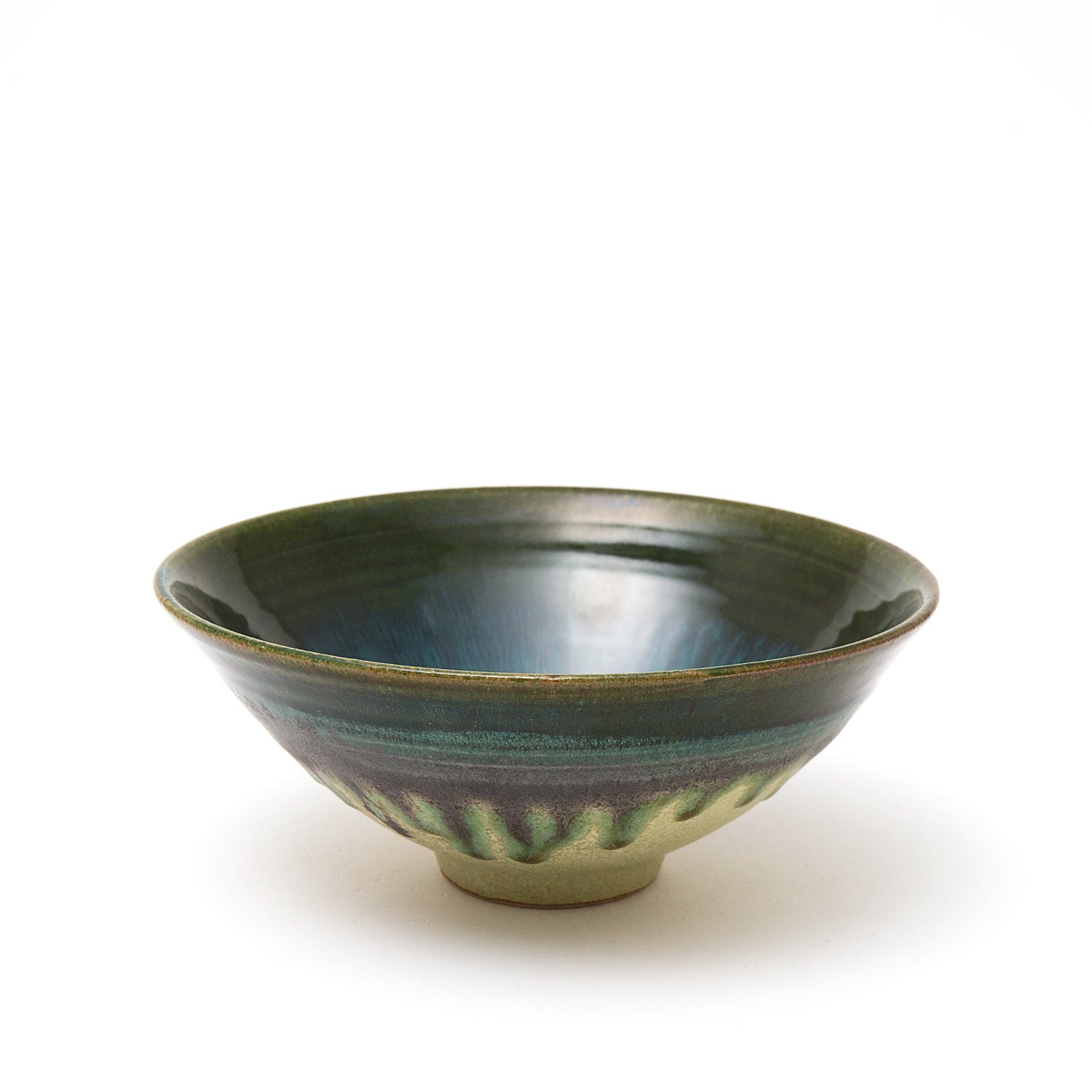 Her sake ‘monsters’ combine Jurassic dinosaur bodies with dainty beaks and curled up feet, while her jungle-green Oribe, cresting and pooling into opaque aquamarine blue, is a thing of prehistoric beauty.