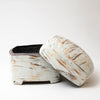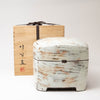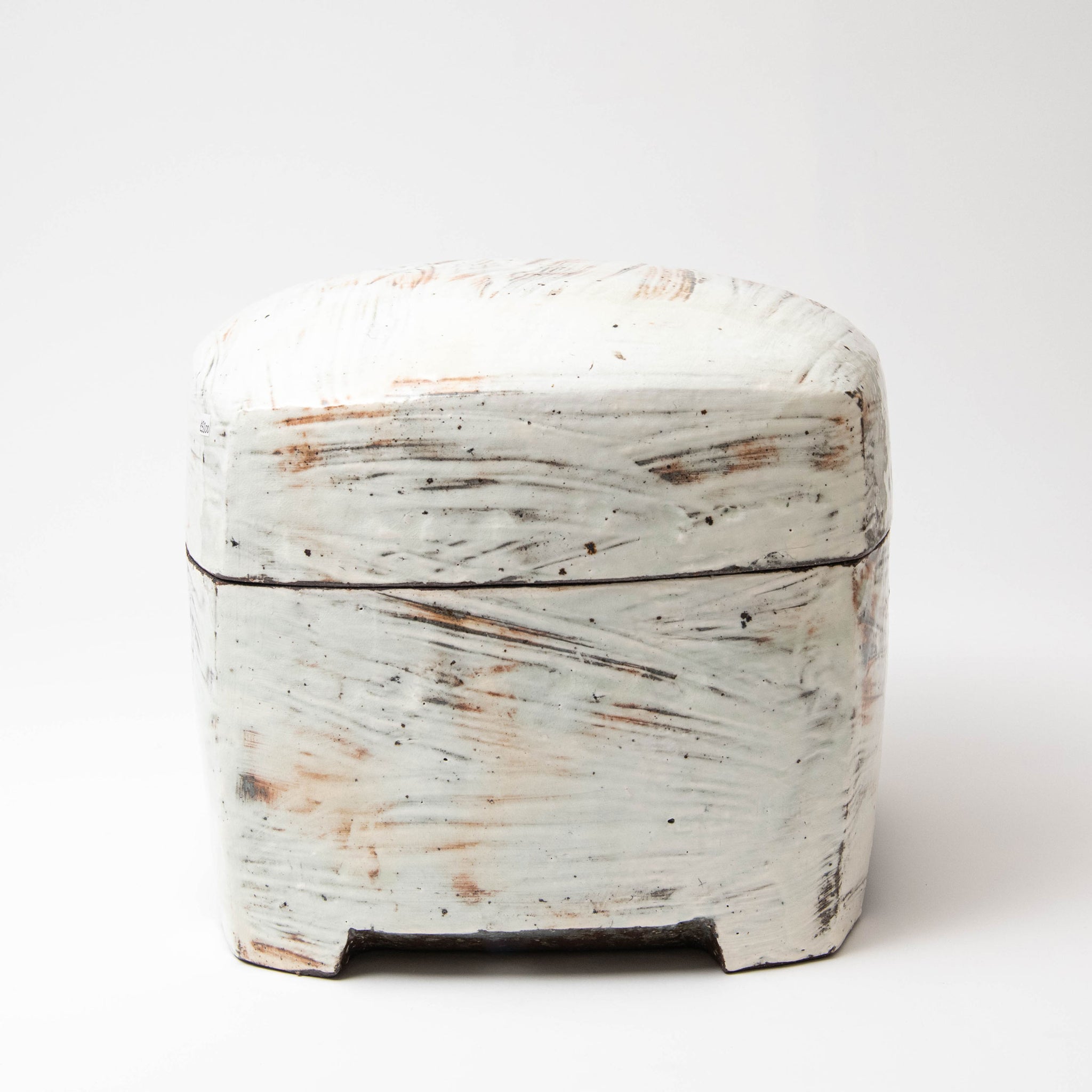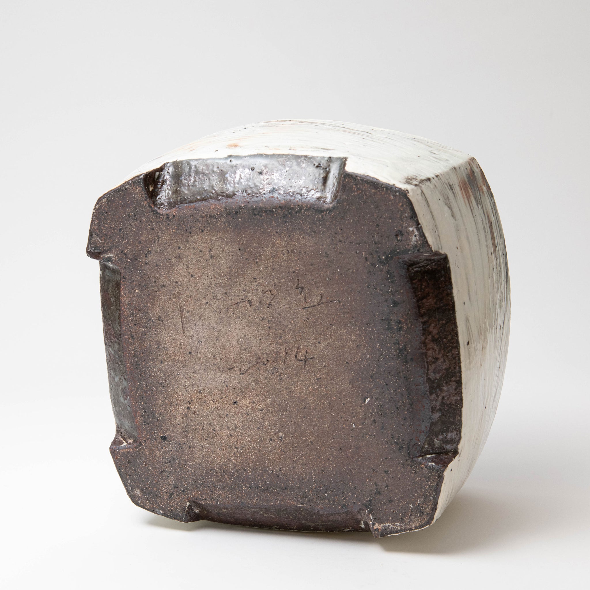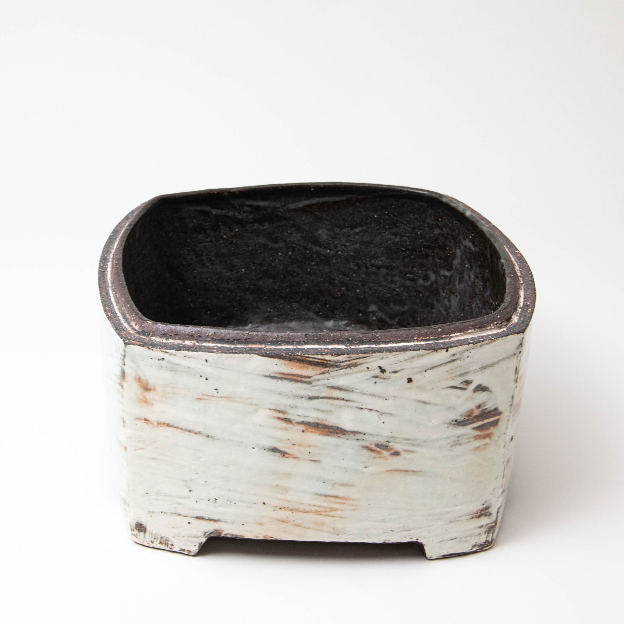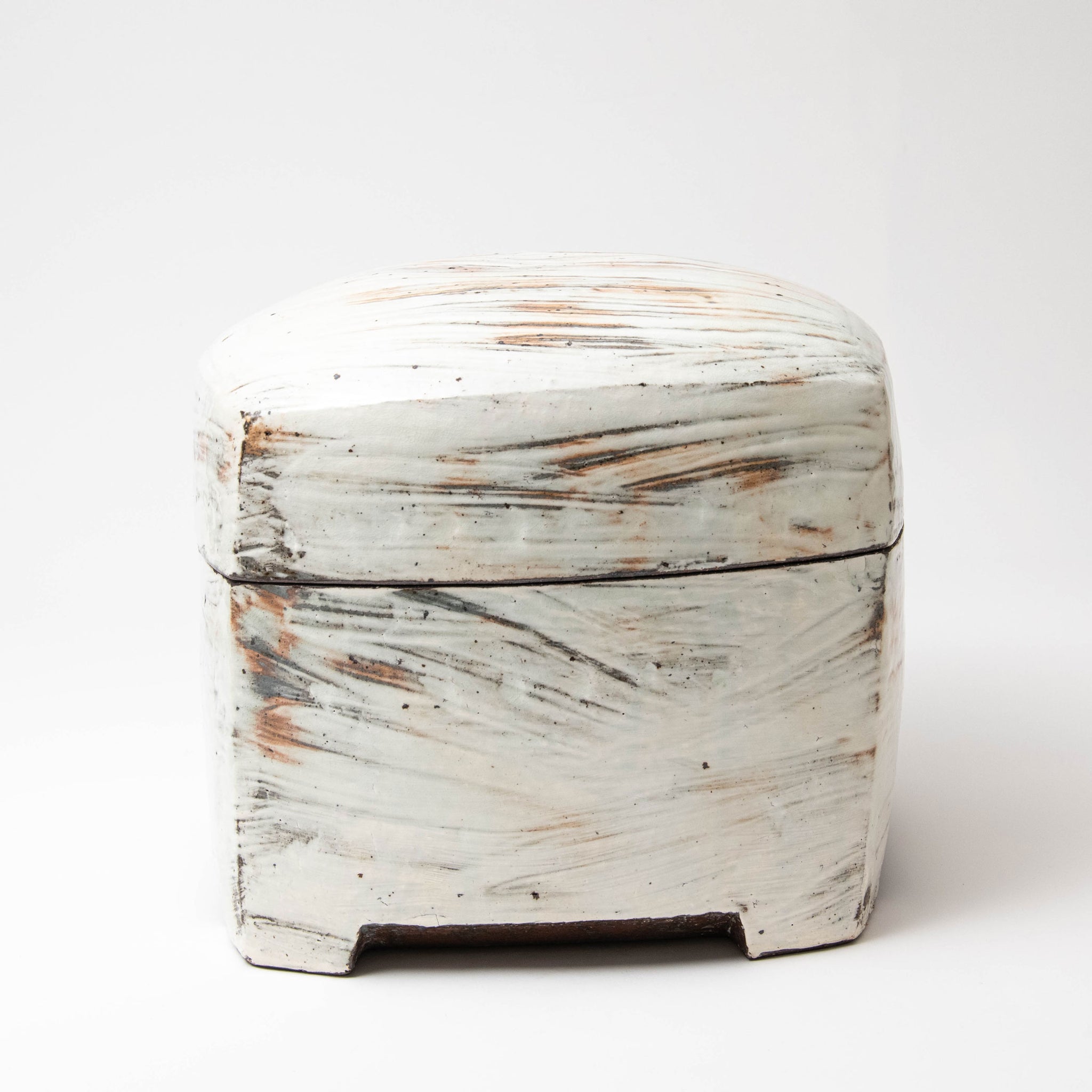 Lee decorates his pots using the traditional Korean method of Punch'ŏng. White slip is applied to a dark stoneware body. Spread with his hands, and incised with tools. A stiff bristled brush may be used to scratch into the semi dry surface of the pot.
