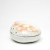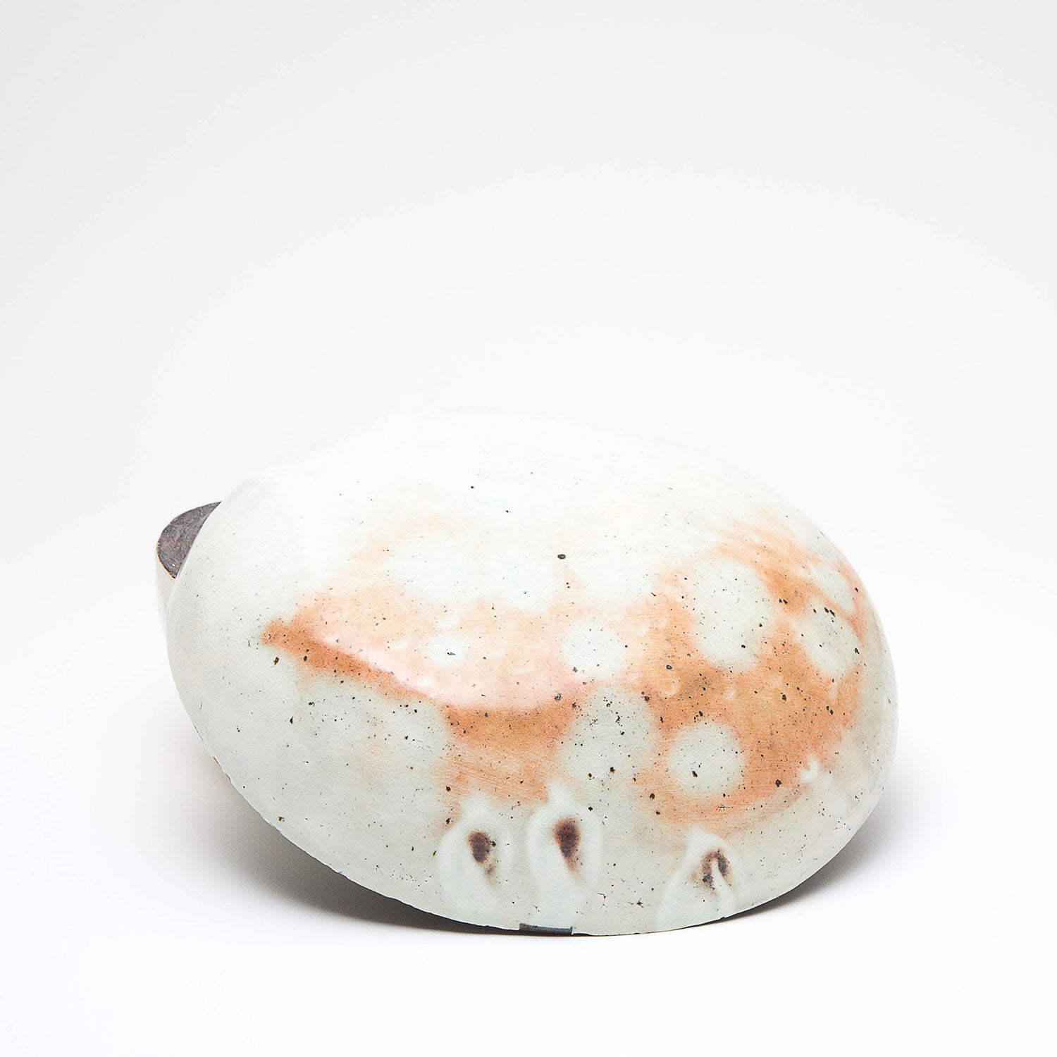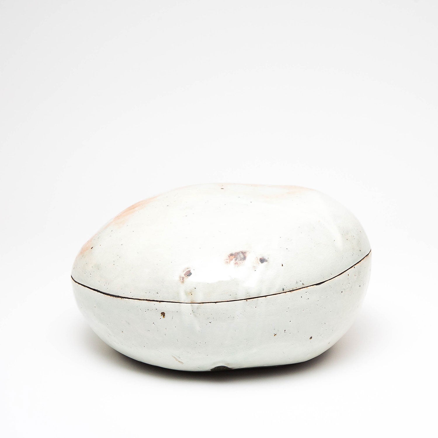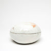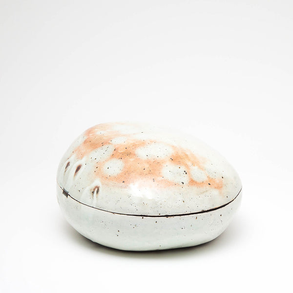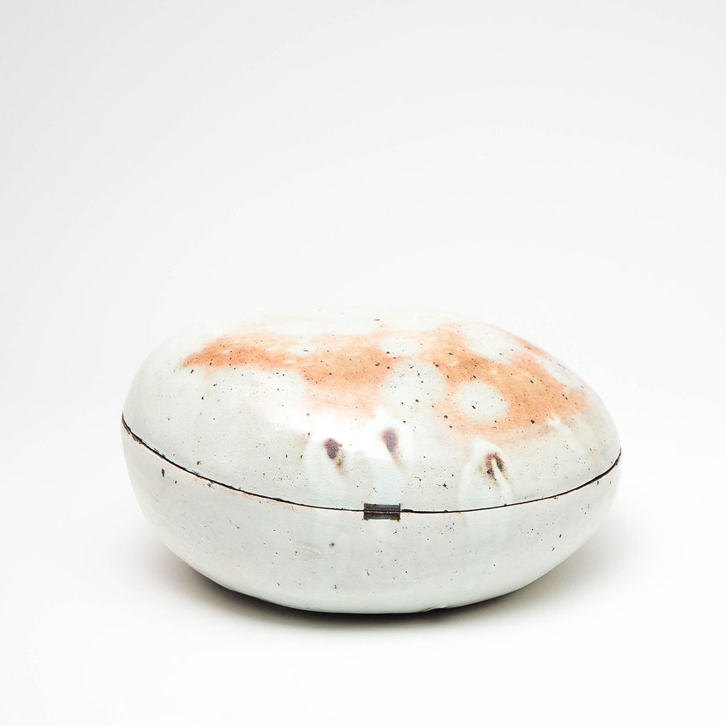 Lee decorates his pots using the traditional Korean method of Punch'ŏng. White slip is applied to a dark stoneware body. Spread with his hands, and incised with tools.