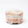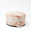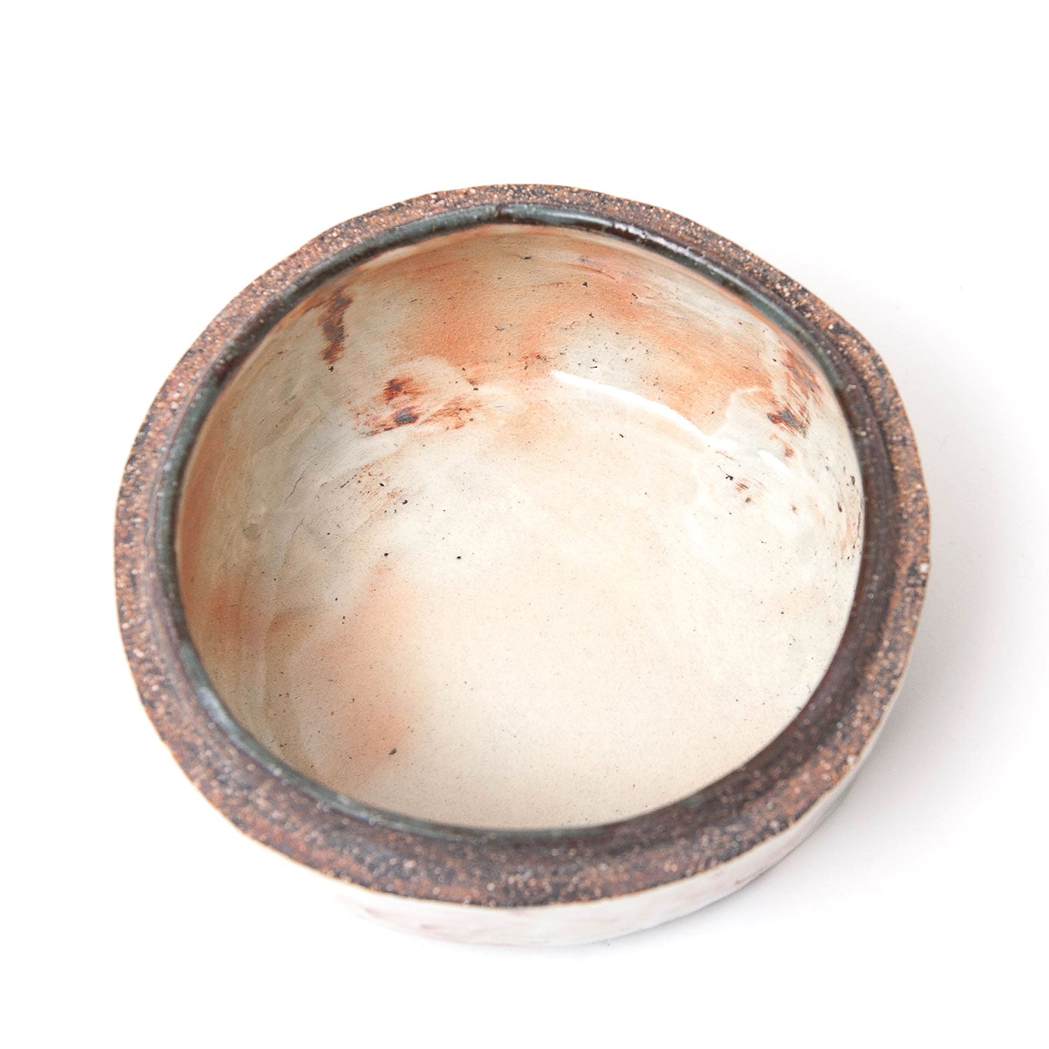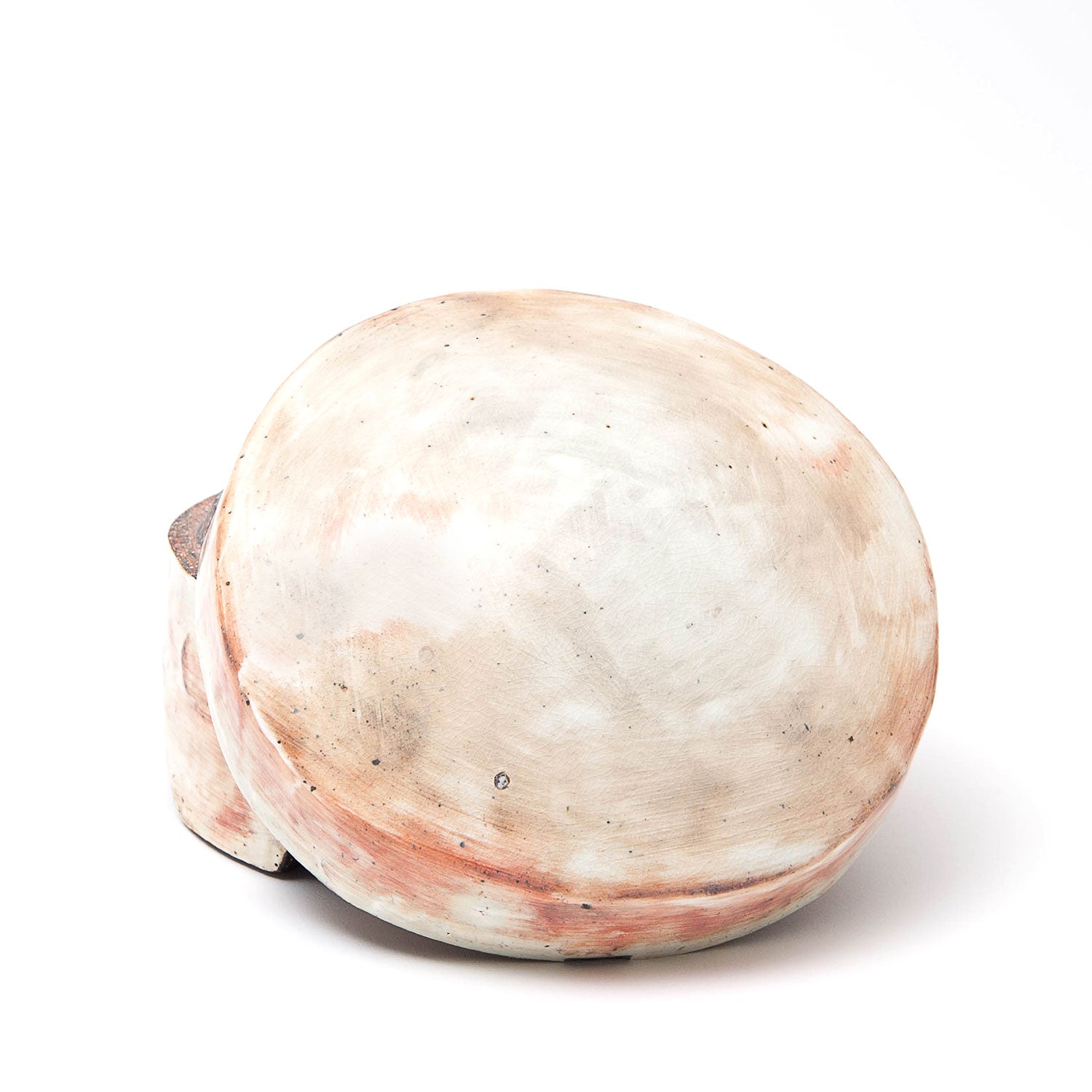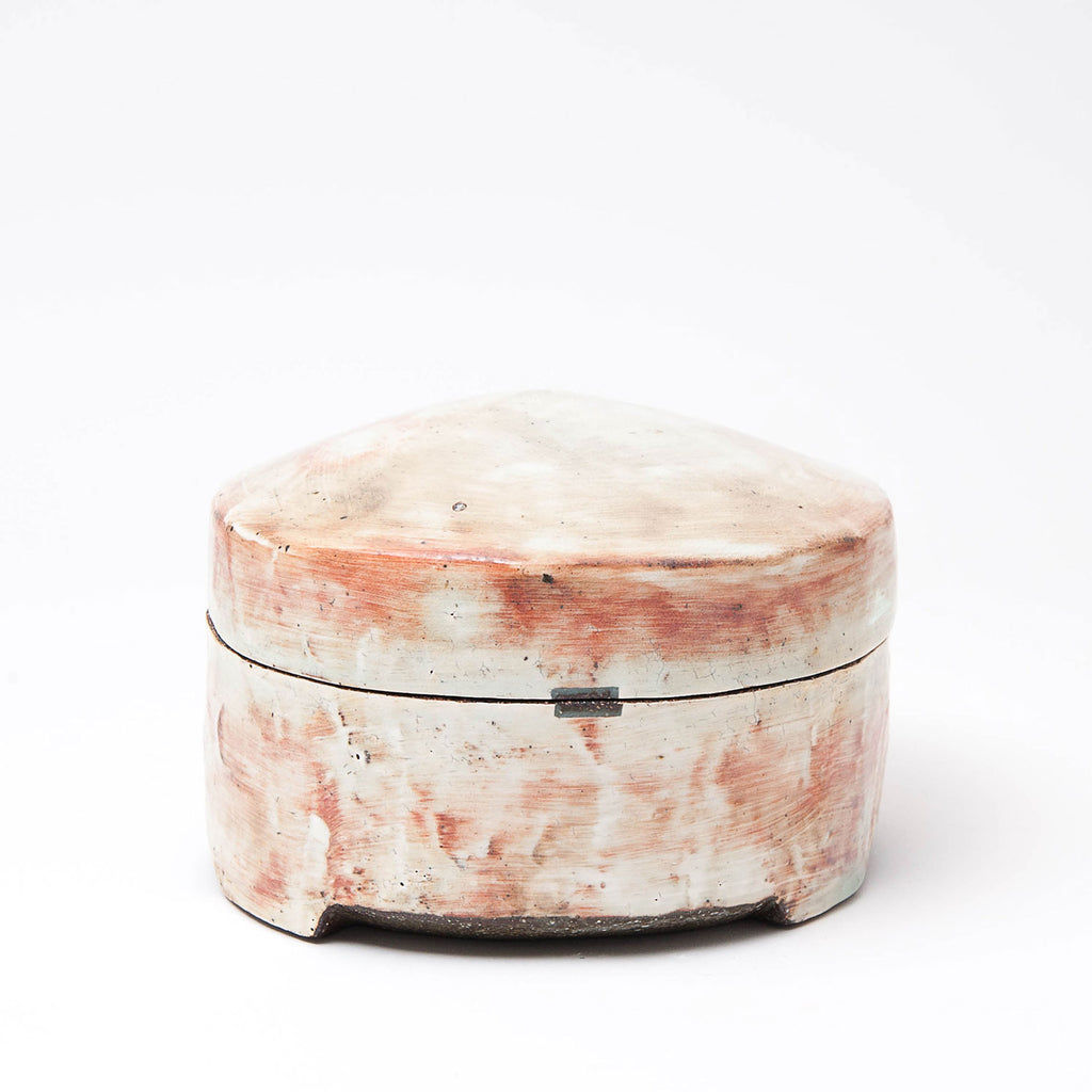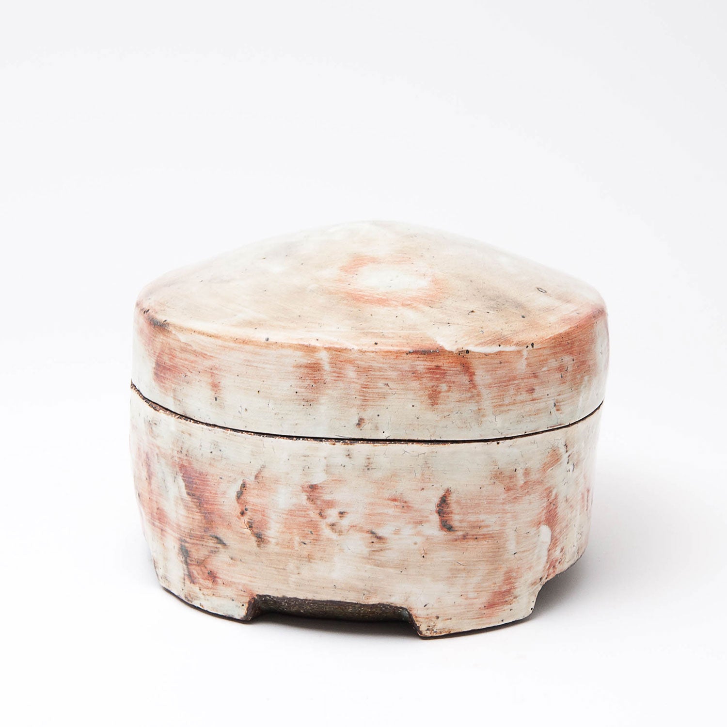 Lee decorates his pots using the traditional Korean method of Punch'ŏng. White slip is applied to a dark stoneware body. Spread with his hands, and incised with tools.