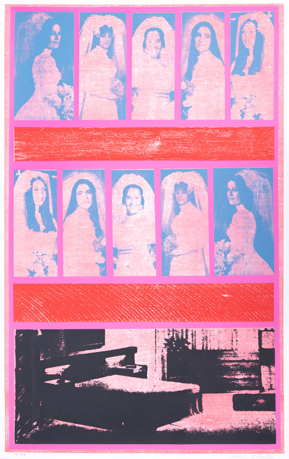 'Beautiful brides of 1971 portrayed in pink and blue, the colours of tenderness, of love, float above the dangerous bed.' MR
