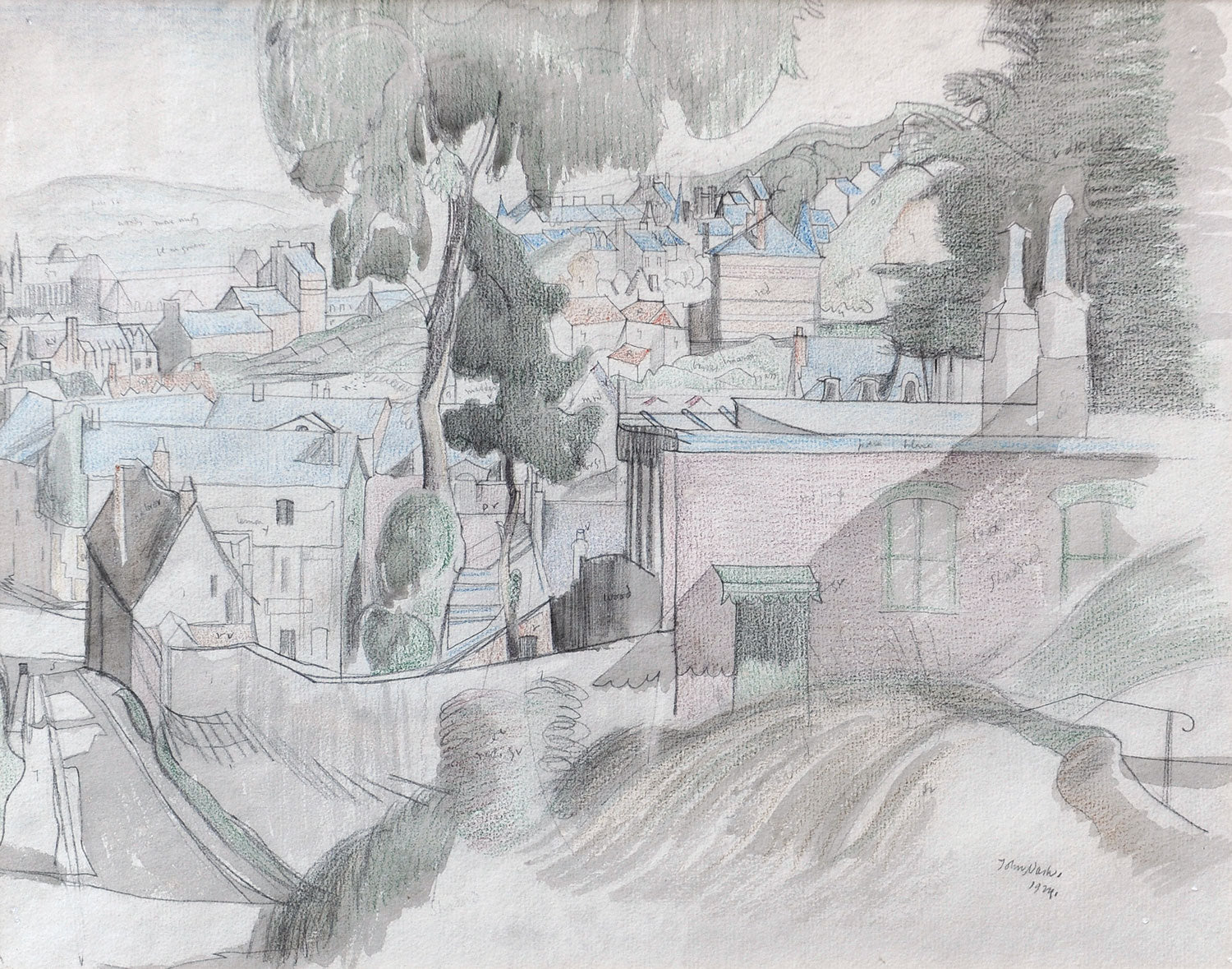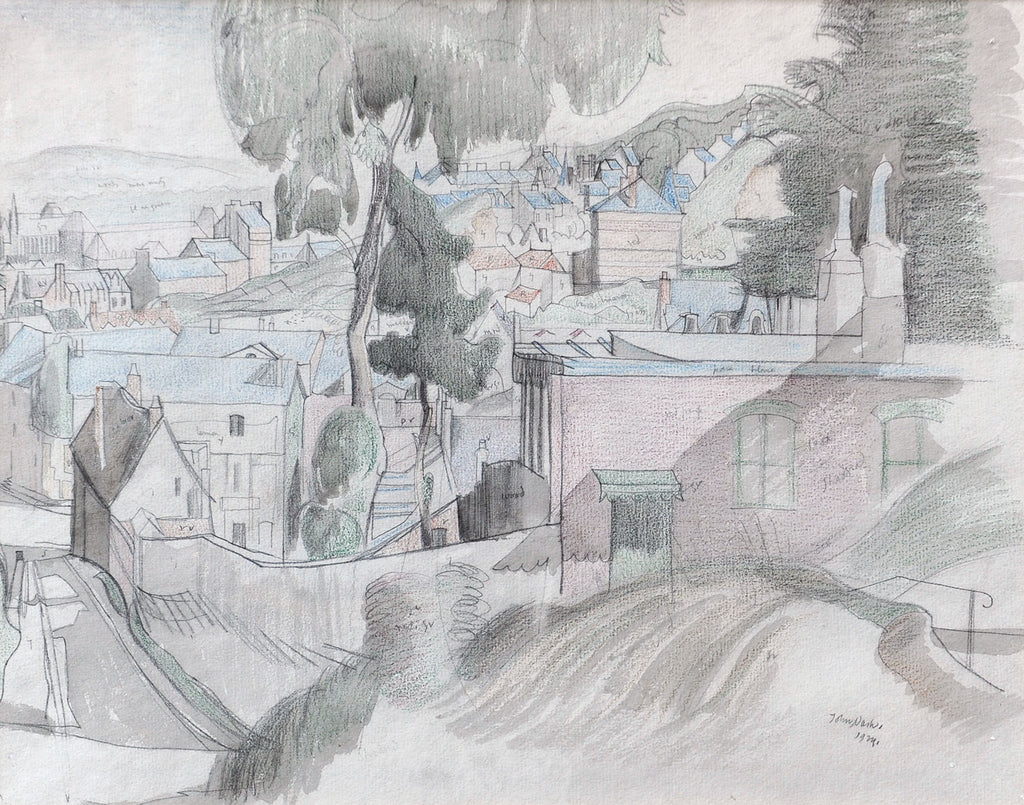 Signed and dated lower right. We think this is Buckfast as it looks like the Abbey in the background. Pencil drawing on reverse.