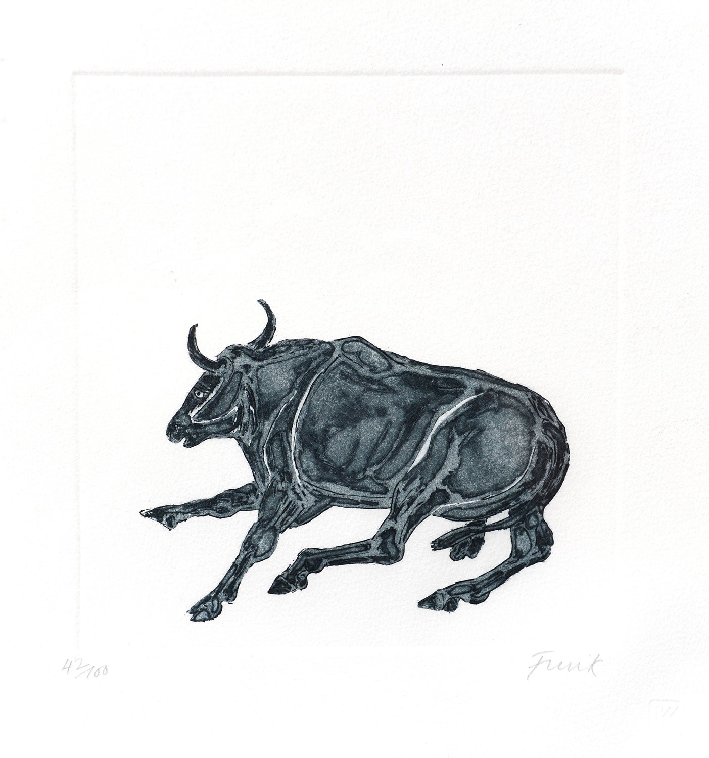 Frink taught at the Royal College of Art and also embarked upon her printmaking career, primarily producing lithographs and etchings. As one of Britain’s leading sculptors, Frink received many public accolades including a C.B.E. (1969), being made a Royal Academician (1977), a Dame of the British Empire (1982) and a Companion of Honour (1992). Elisabeth Frink died in 1993.