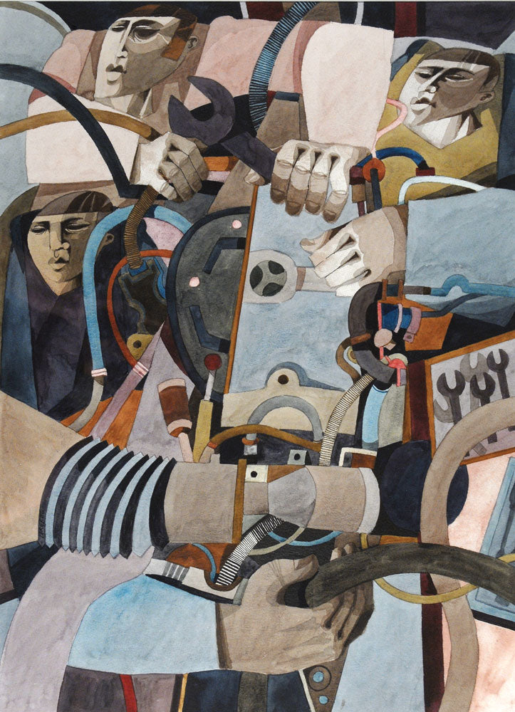 Human figures are important components in Large’s compositions, often men at work, and the work of Edward Burra and Stanley Spencer has been influential upon Large’s art. He has held several solo exhibitions and was commissioned to do a mural for Kings Cross Thameslink Station. In recent years he has lived and painted in Rutland and Malta.