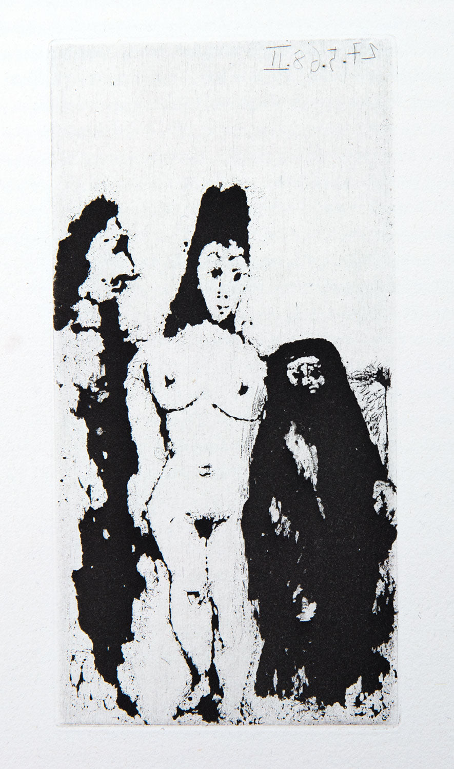 Between March 16 and October 5, 1968, Picasso worked on the plates almost daily, using various techniques (sometimes on the same plate); he was impatient to see the impression as soon as it was pulled by Aldo and Piero Crommelynck, who had installed their atelier at Mougins.
