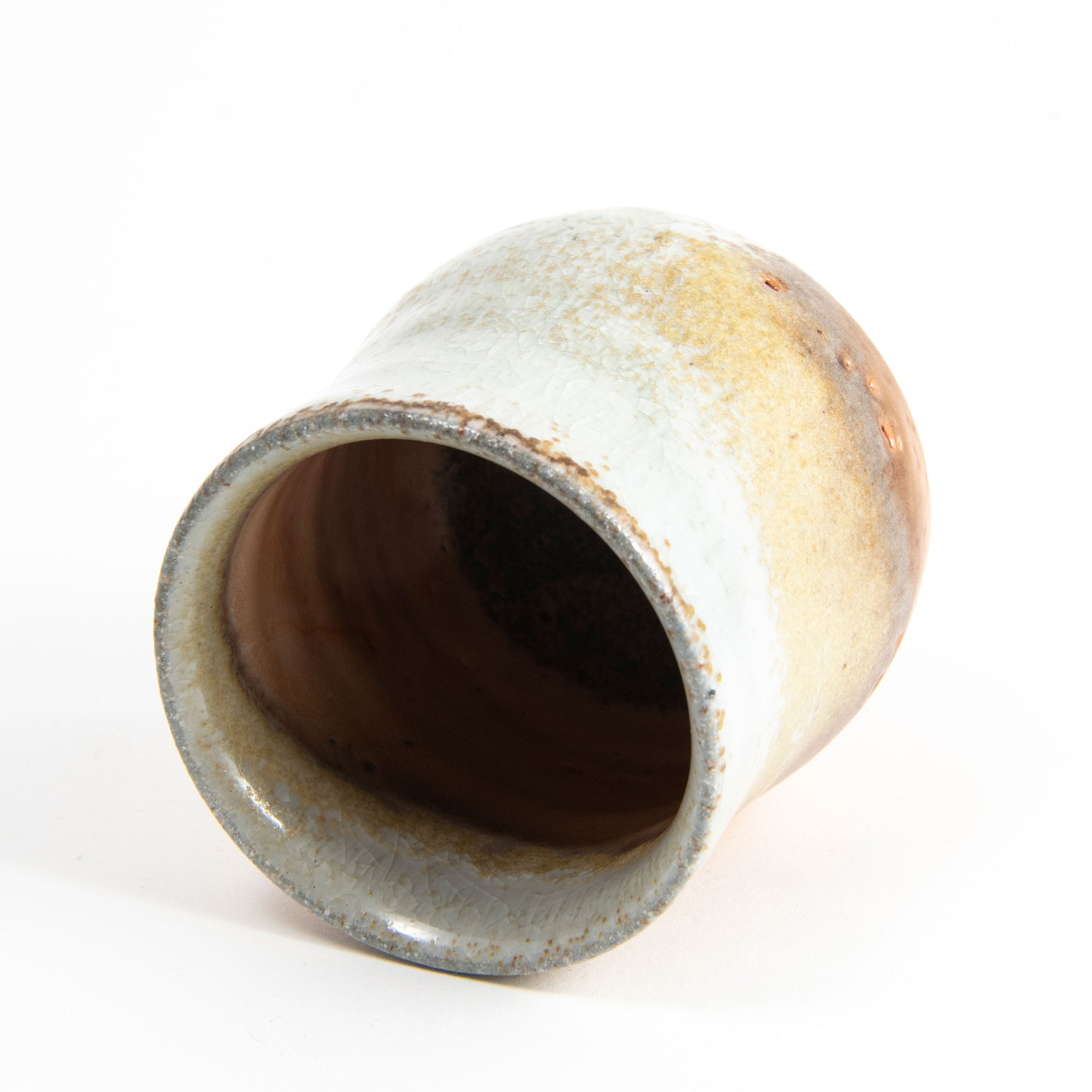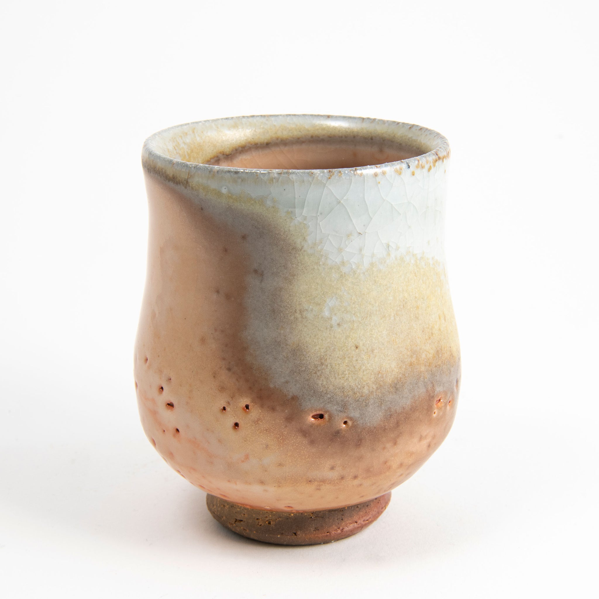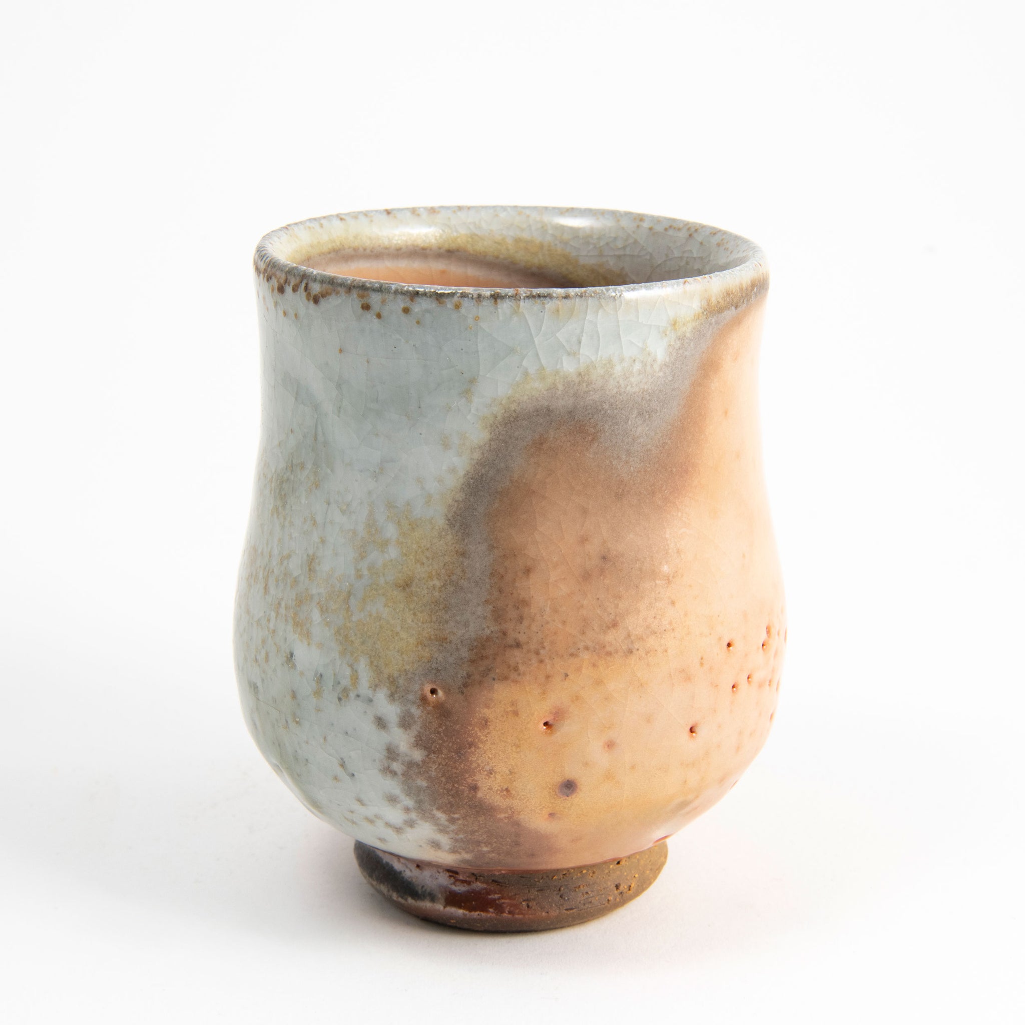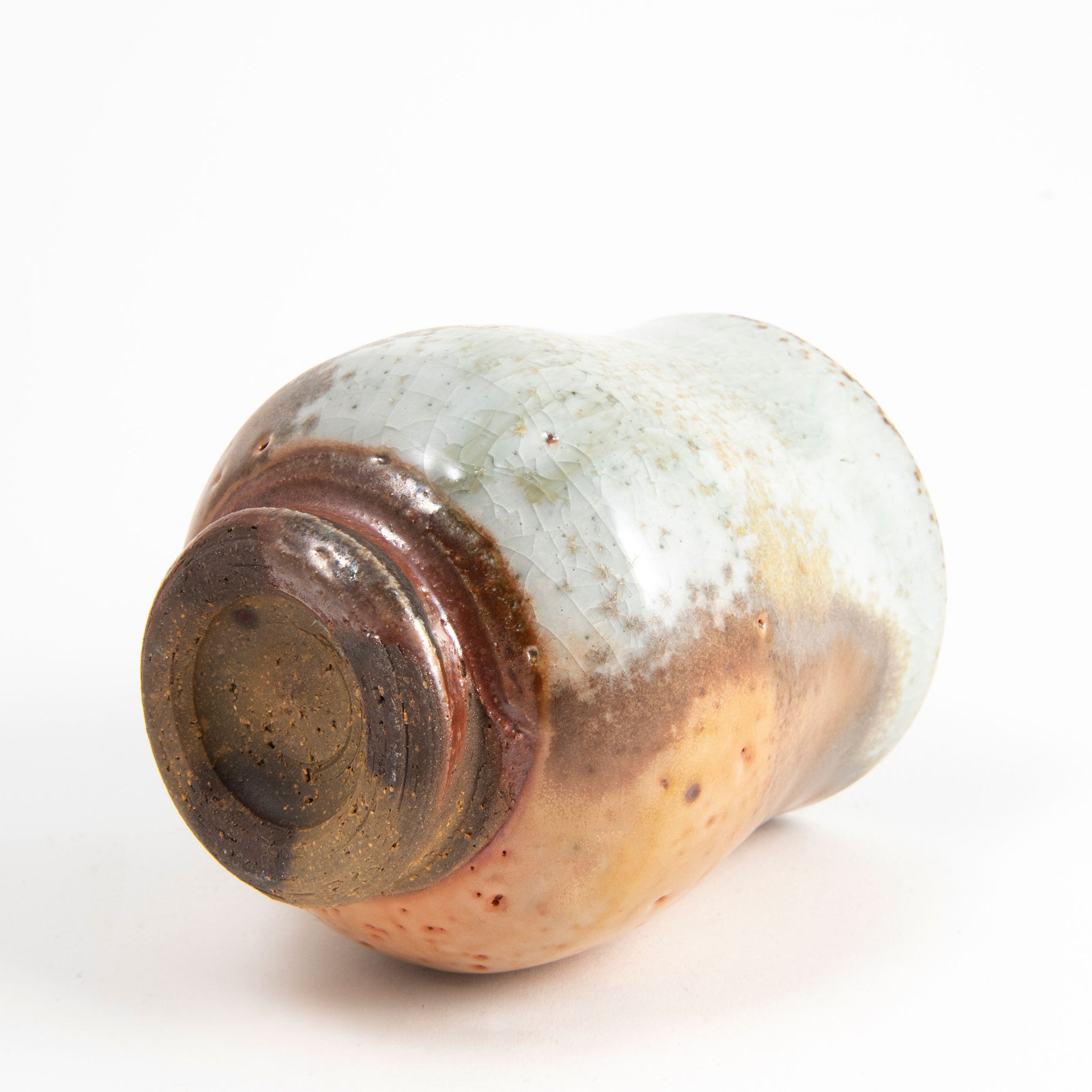 Shino glaze with natural ash deposits. Wood fired