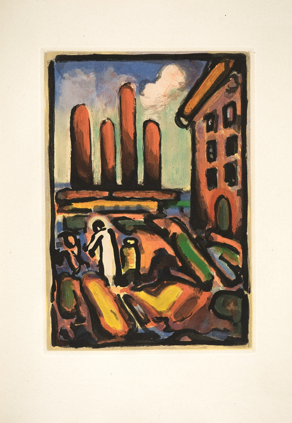 During the decade before the Great War, Rouault developed themes in his art including depictions of the circus, prostitutes, law courts and religion. In 1913 the renowned art dealer Vollard purchased all of Rouault’s artistic output and four years later became his sole agent, setting him up in a studio and offering commissions. In the inter war period Rouault was best known for his popular prints. He died in 1958.
