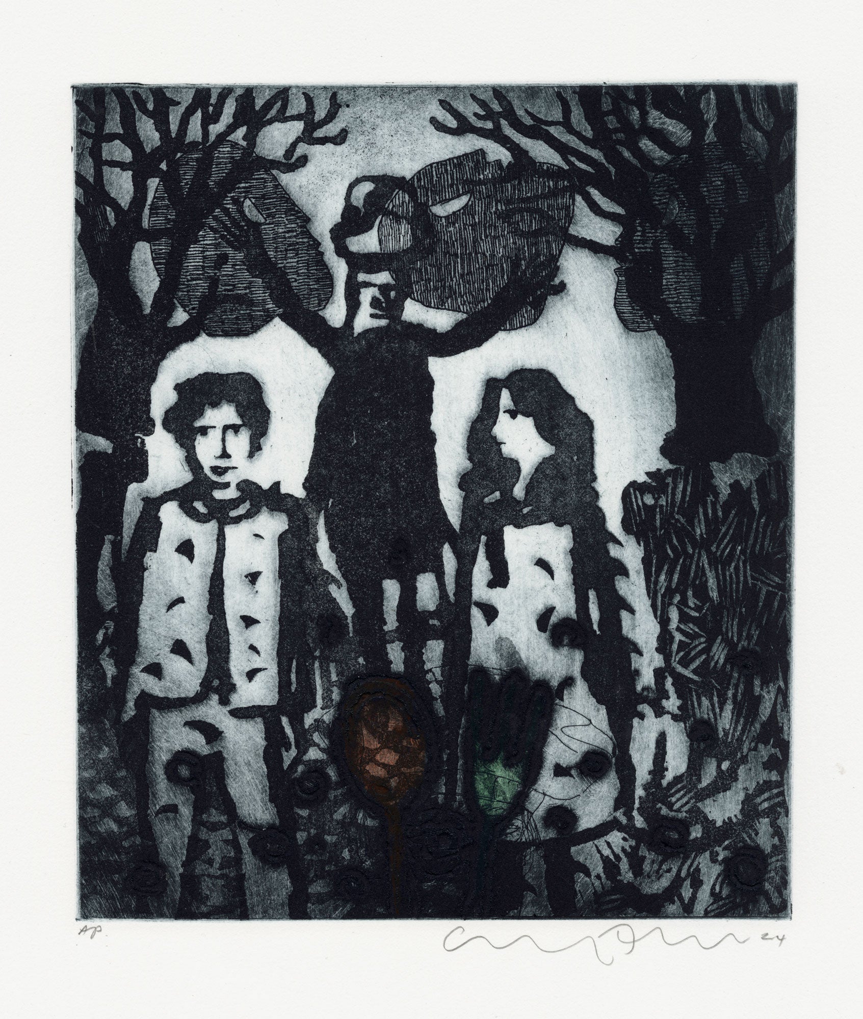 Signed etching with sugarlift, aquatint, carborundum and hand colouring.