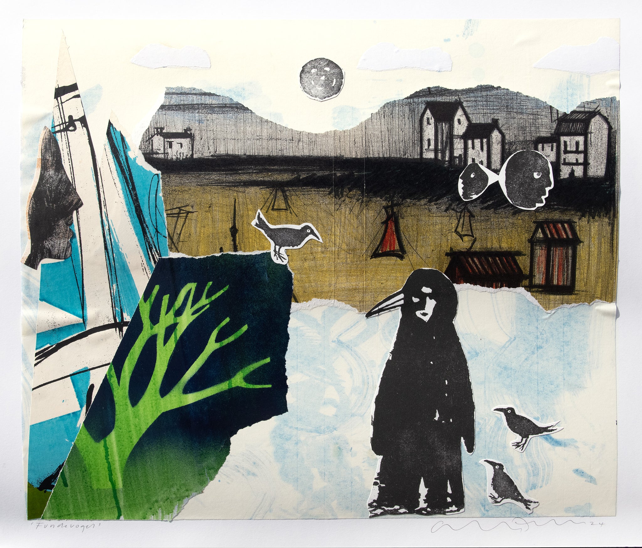 Collage includes found papers, painted and printed material by Wood and characters from cut down etchings that the artist has made for the series.