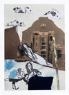 Collage includes found papers, painted and printed material by Wood and characters from cut down etchings that the artist has made for the series.