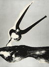 Colour linocut, black, blue and grey ink on cartridge paper. Photoscreen from elmwood fragment with screen of artist's pincers withdrawing a steel foil clench on metallic lino ground.