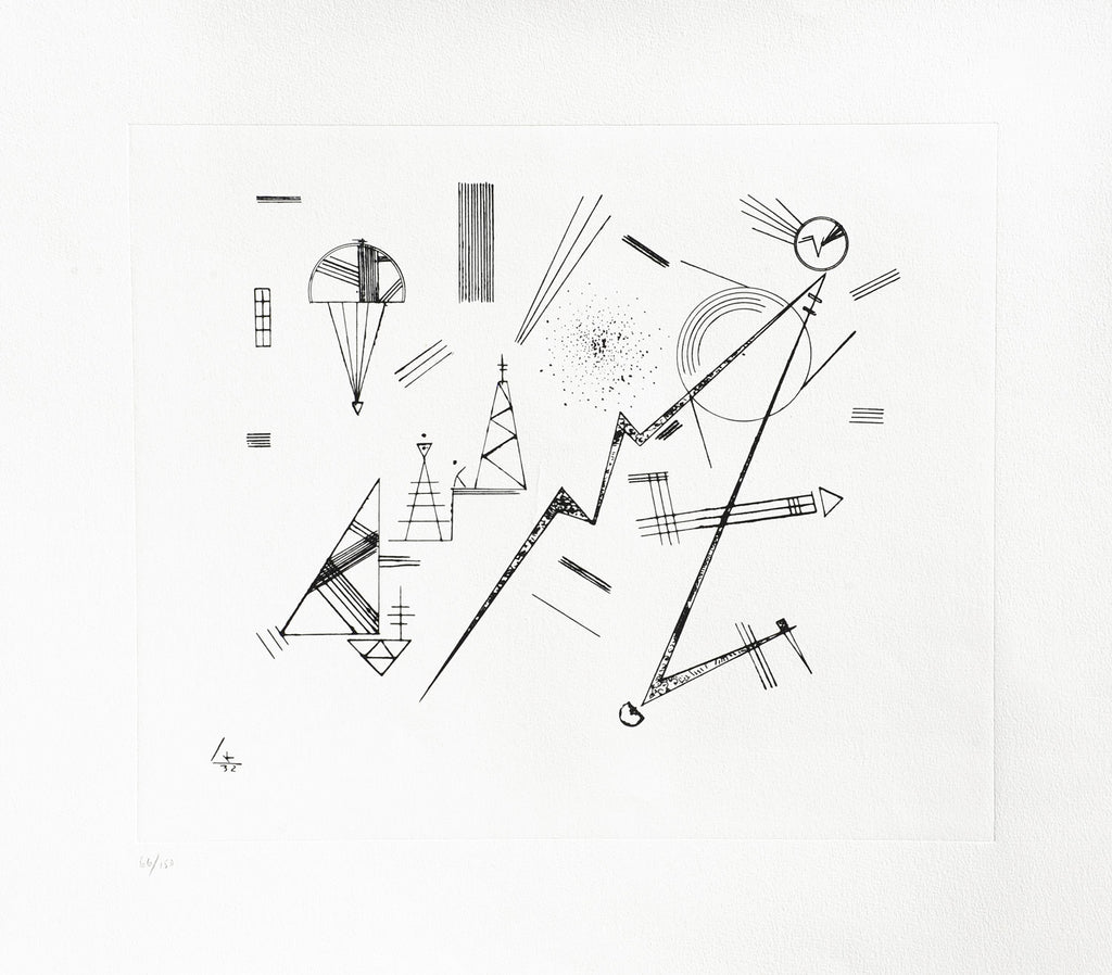 This silkscreen is numbered 66/150, signed in the plate by the artist and dated 1932. Verso there is a stamped signature Kandinsky and the signed in pen by his widow Nina Kandinsky.