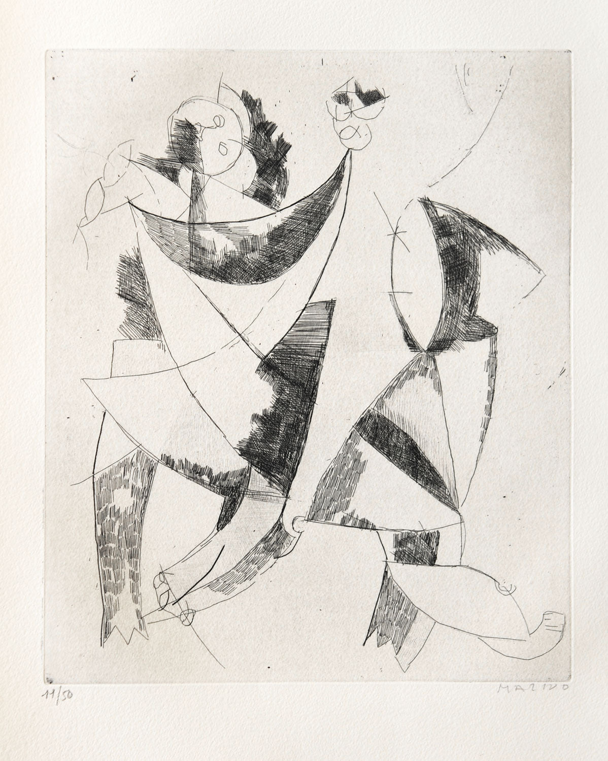 The horse and rider and simple nudes take their inspiration from Etruscan art and classical mythology and are enduring themes throughout Marini's sculpture and printmaking.