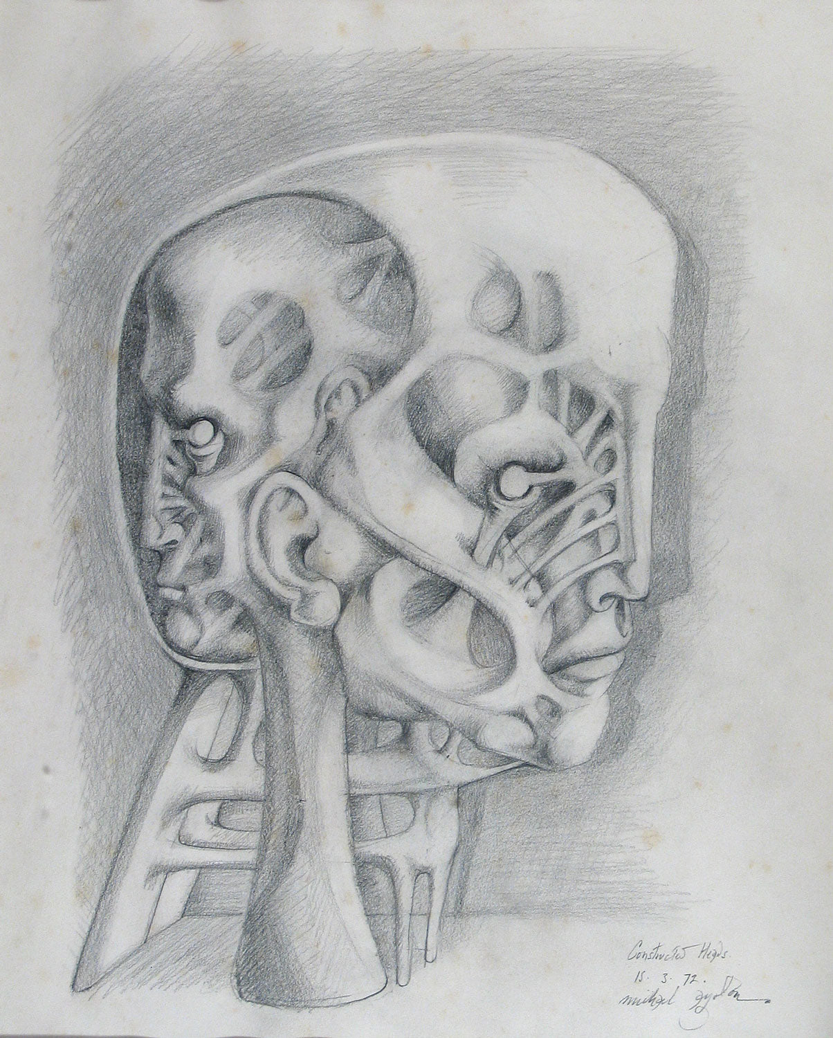 For this drawing Ayrton developed the theme of his Maze Heads series of 1964-65. Rather than viewing the inside of the head as a metaphor for the complexities of a maze, Ayrton experimented with skeletal inter-penetrating heads, resulting in this fantastic signed, titled and dated pencil drawing.
