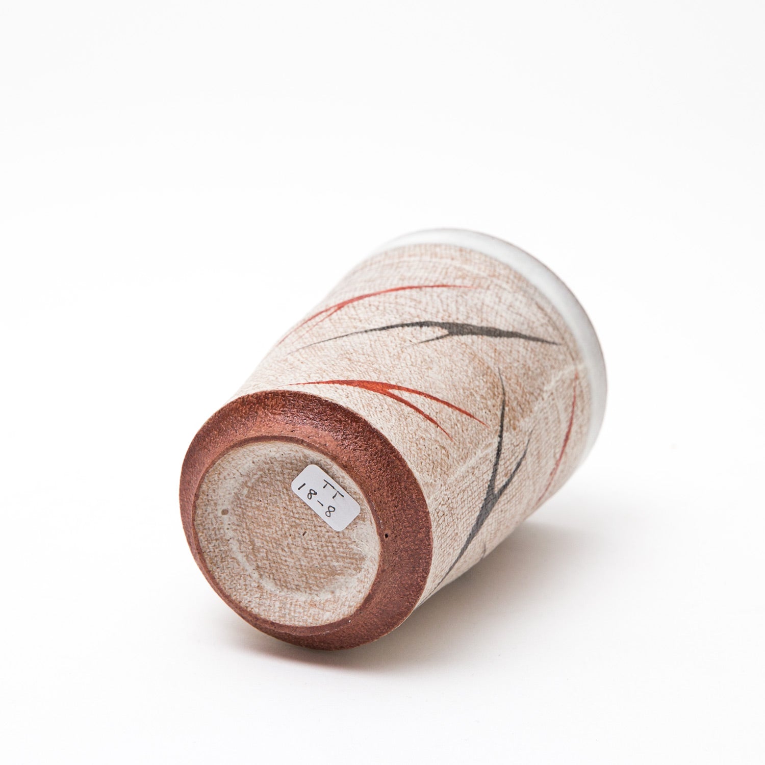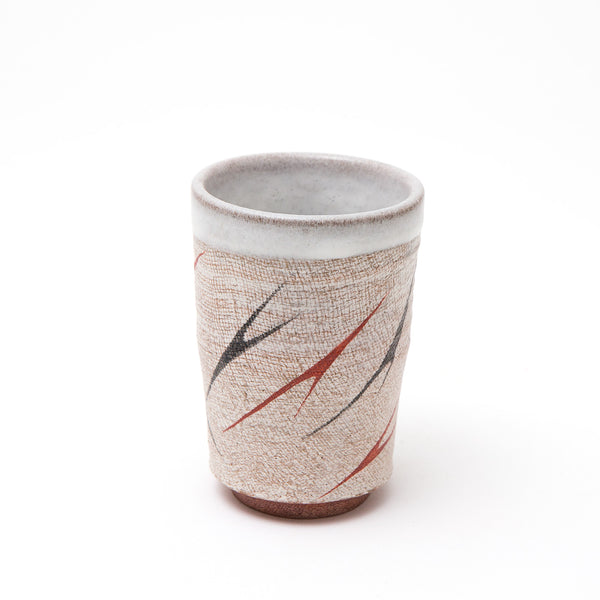 Aboriginal arrowheads straight out of Australia dance across Toshihiko Takeda’s hand-painted cups and vases, their surfaces textured like hessian cloth.