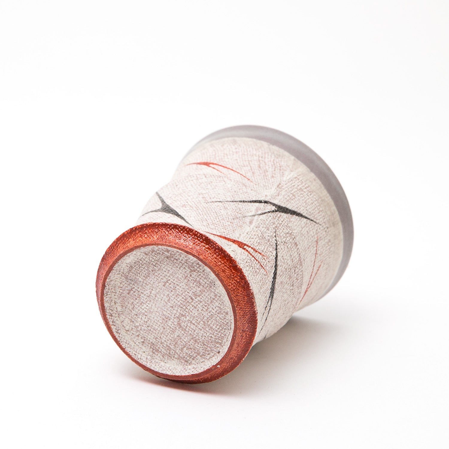 Aboriginal arrowheads straight out of Australia dance across Toshihiko Takeda’s hand-painted cups and vases, their surfaces textured like hessian cloth.
