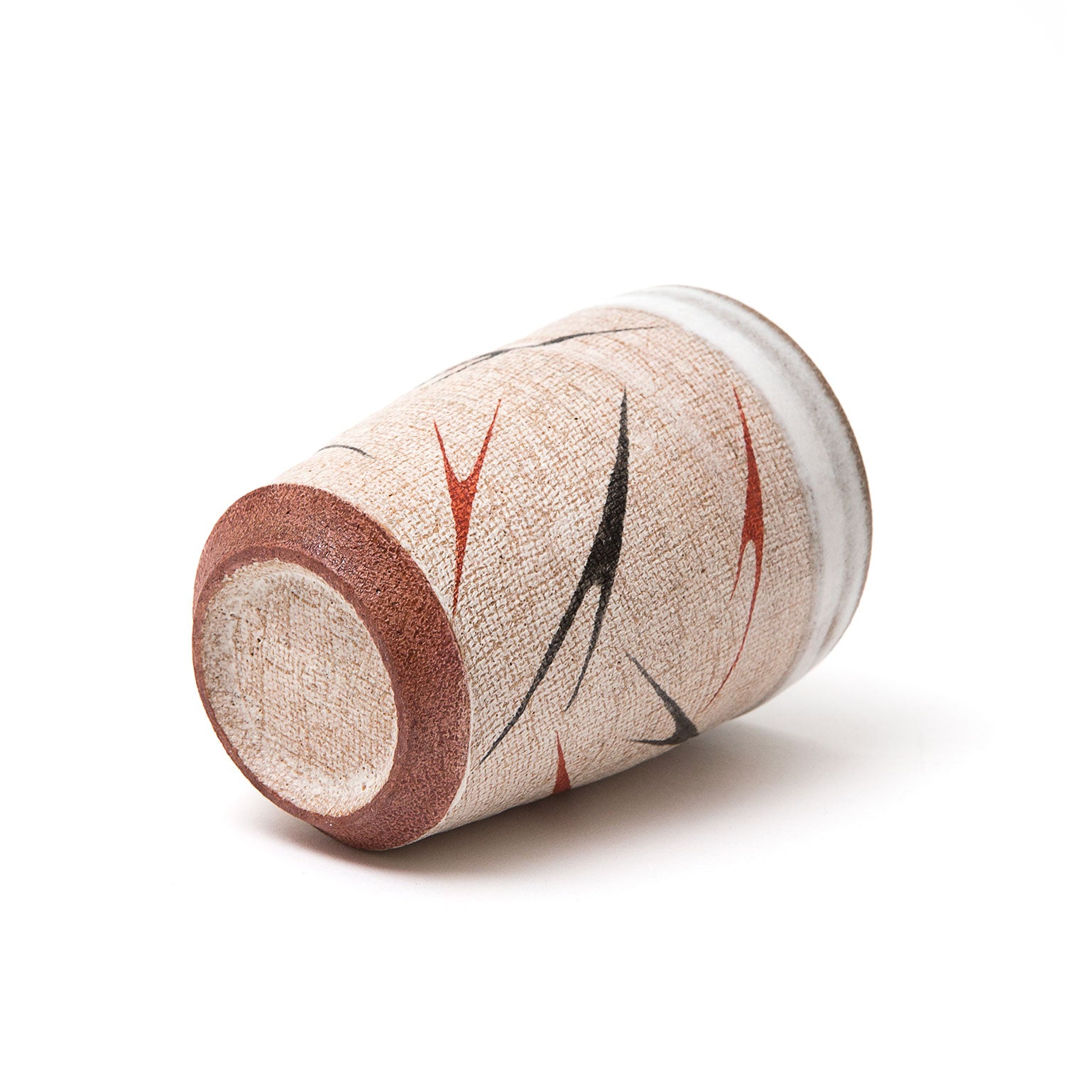 Aboriginal arrowheads straight out of Australia dance across Toshihiko Takeda’s hand-painted cups and vases, their surfaces textured like hessian cloth.