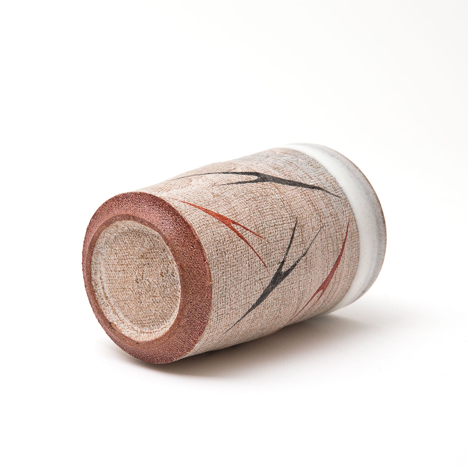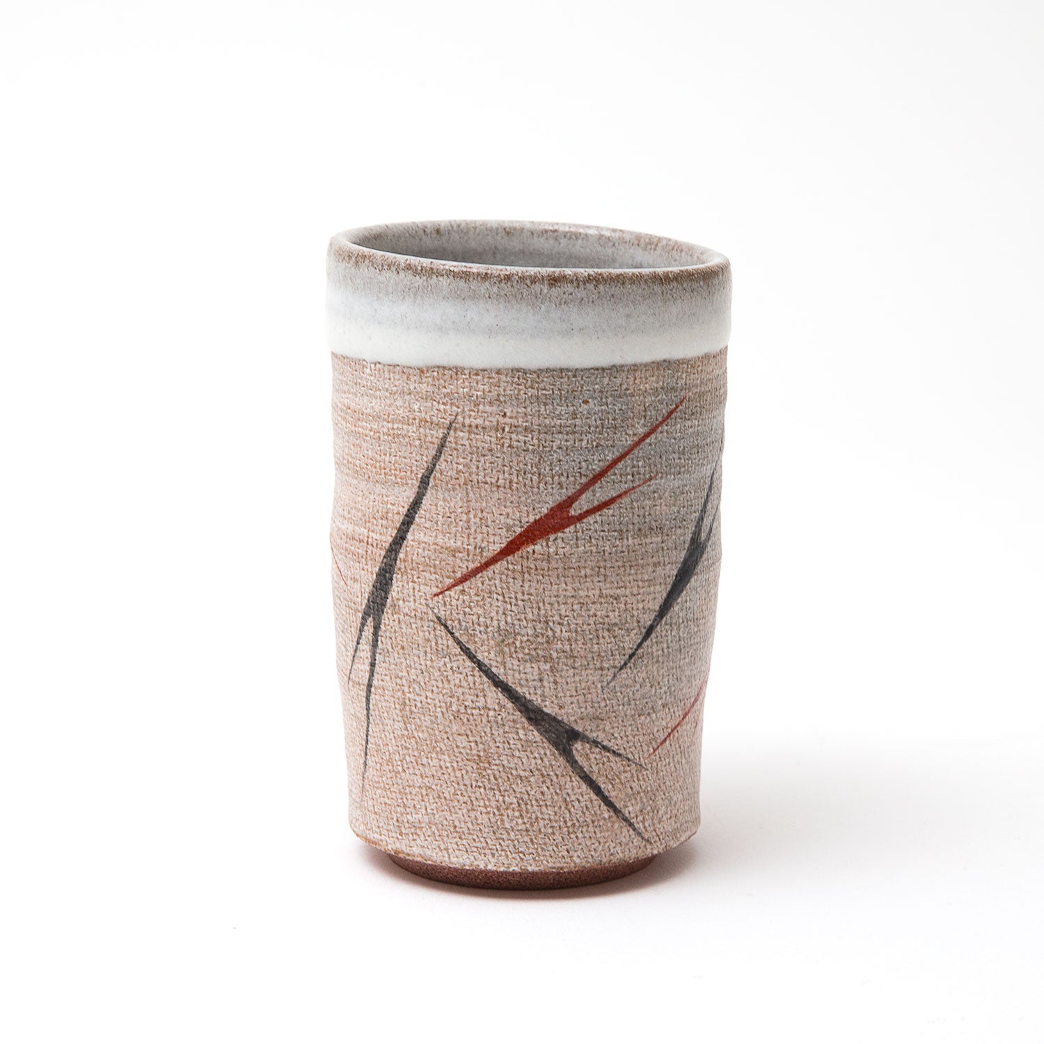 Aboriginal arrowheads straight out of Australia dance across Toshihiko Takeda’s hand-painted cups and vases, their surfaces textured like hessian cloth.