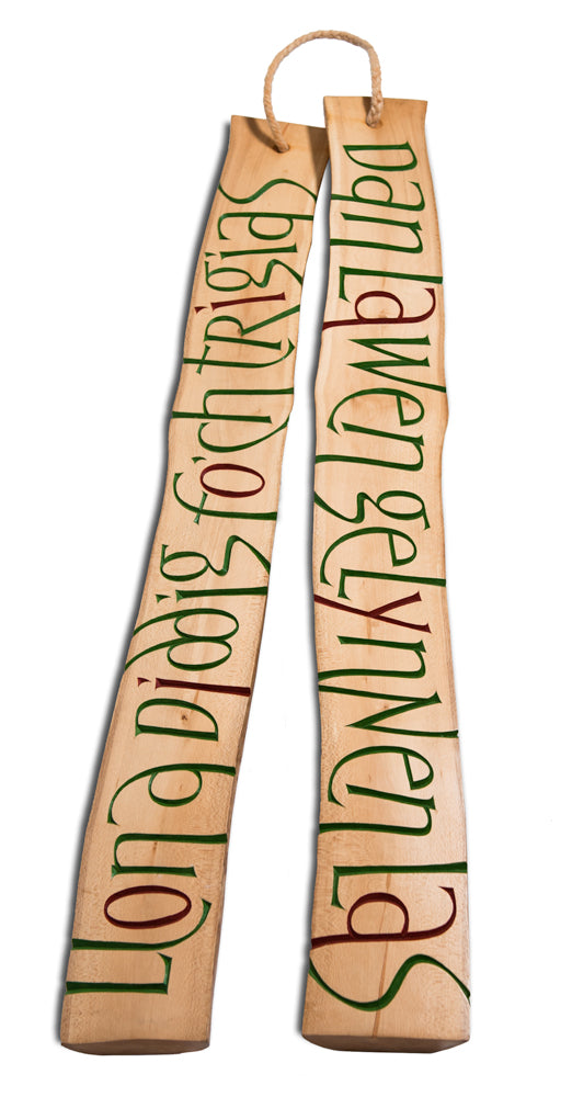 80.5 x 9.5 x 10 cm. This is two pieces together. Llon a diddig fo'ch trigias (peaceful and without anger be your dwelling). Dan lawen gelynen las (under the happy green holly) Dan y Gelynnen. Holly wood left on the woodland floor in Menai Woods, Bangor after scrub clearance, until the bark had decayed just enough to be peeled off, but the wood had not begun to rot. The words are from an englyn (a flour line Welsh verse in strict metrical and alliterative form) by T. Llew Jones. Translation: 'Peaceful and without anger be your dwelling, under the happy green holly'. The stresses vowels are emphasised by red colouring, and the piece is made so that it can be hung open to show the words, or closed to show the beautiful markings left by the decaying bark.