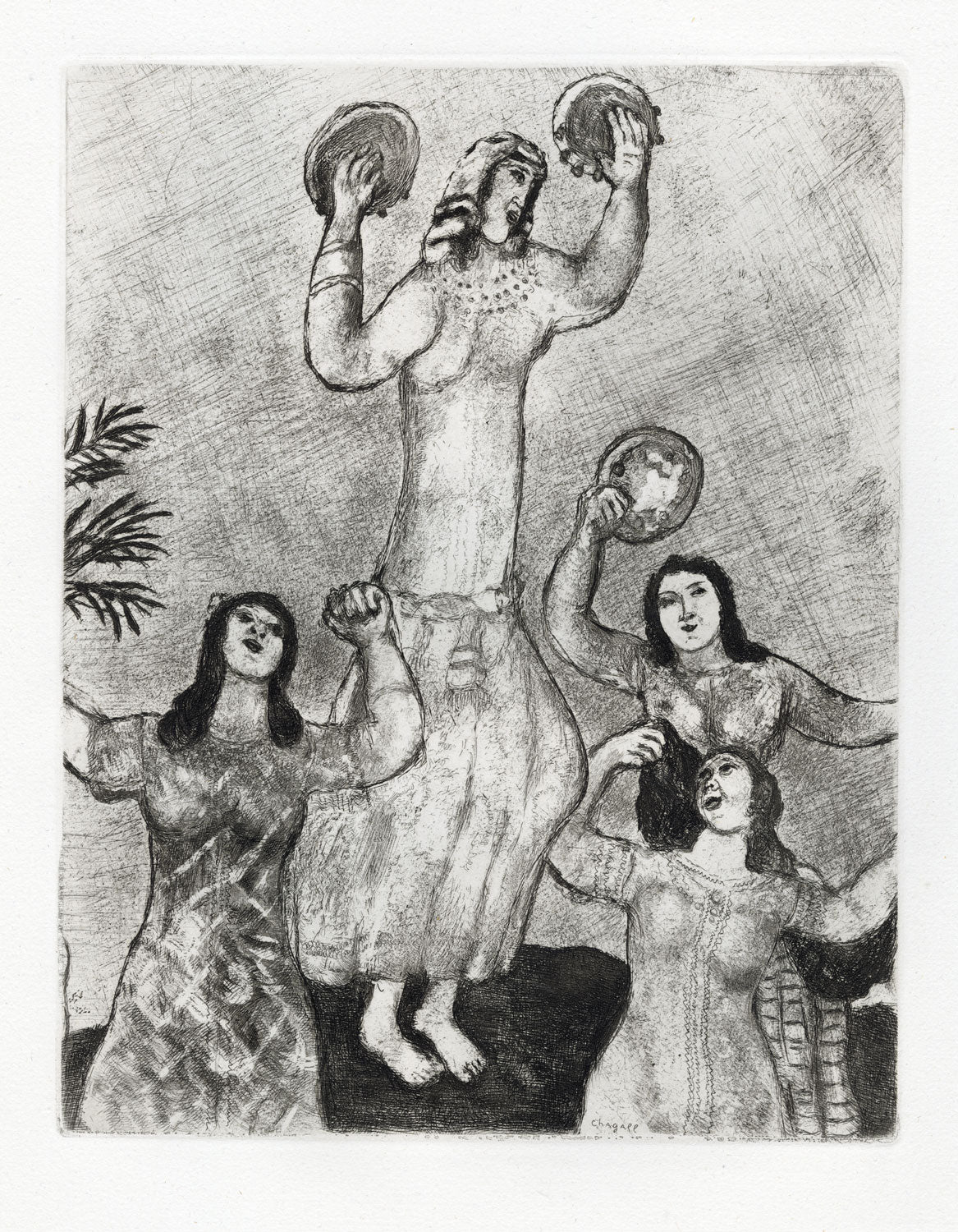 This etching is from Chagall’s sublime Bible series. Almost 10 years in the making, and comprising over 100 etchings, it was the third of Chagall’s etching suites to be commissioned by the publisher Ambroise Vollard. Chagall’s Jewish identity had always informed his work; in this major suite, begun in 1930, it was to take centre stage.
