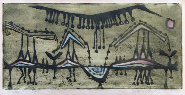 Living in Camden with his father’s press installed, Clarke experimented with aquatint as well as moving into the medium of sculpture. Alongside commissions in iron Clarke took advantage of the post-war architectural boom, producing large-scale works in various materials for significant buildings. His commissions include works for Suffolk College and Coventry Cathedral. In 1975 he was elected RA, and his work is held in major British collections.